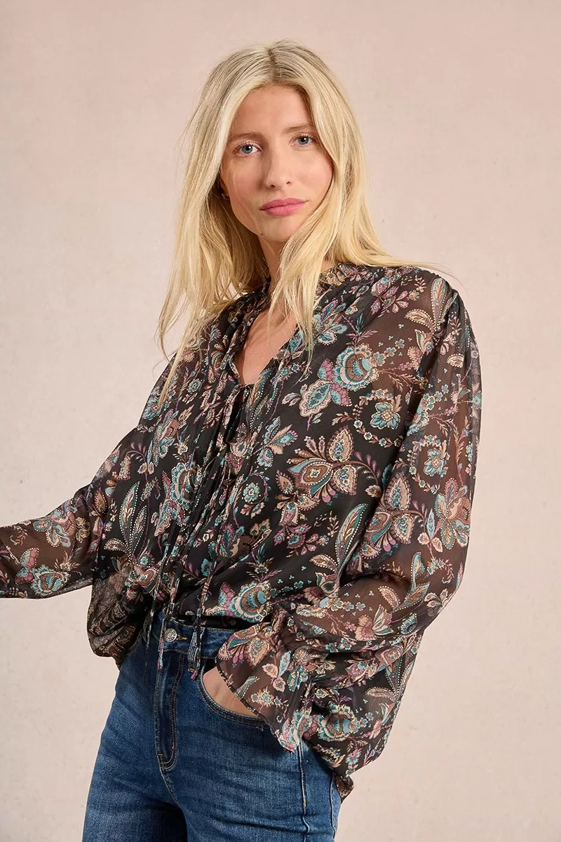 Blusa Molly Bracken  de modelo solto estampada, semitransparente, gola redonda franzida, decote em V profundo com cordão e mangas compridas fluidas com punhos elásticos. Forrada com top removível.