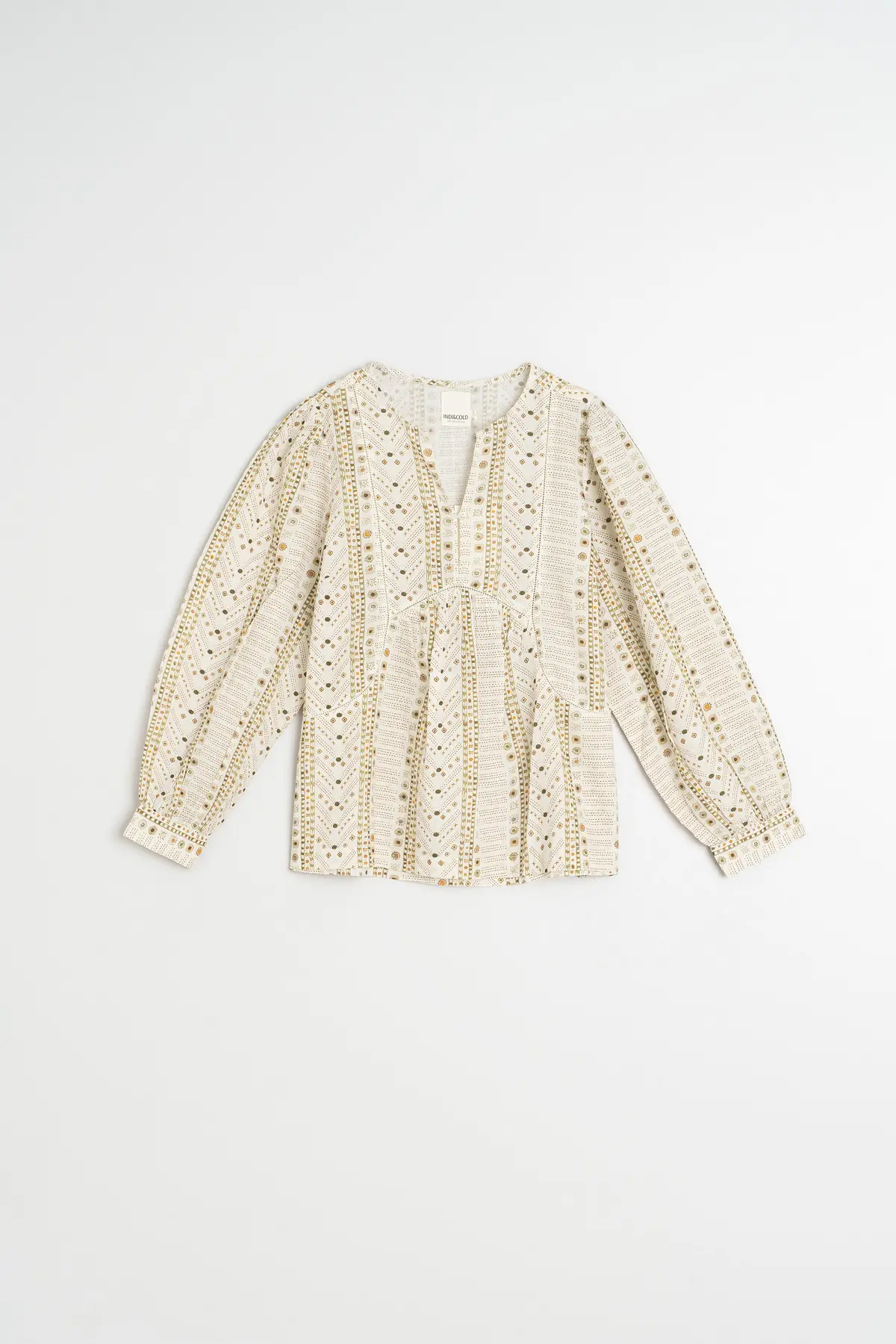 Blusa Indi&Cold com estampa, gola redonda com decote em V com botões, ombros ajustados e mangas compridas com punho e botão, detalhes de bainha na cintura.