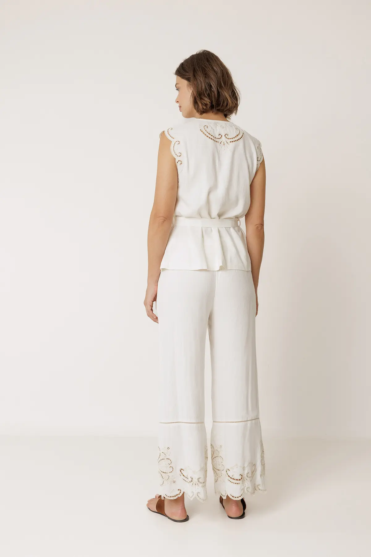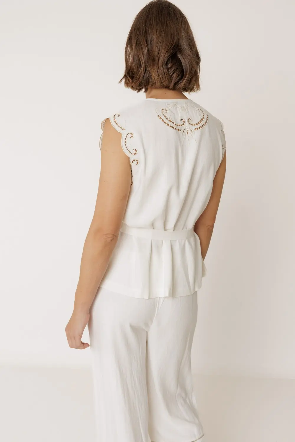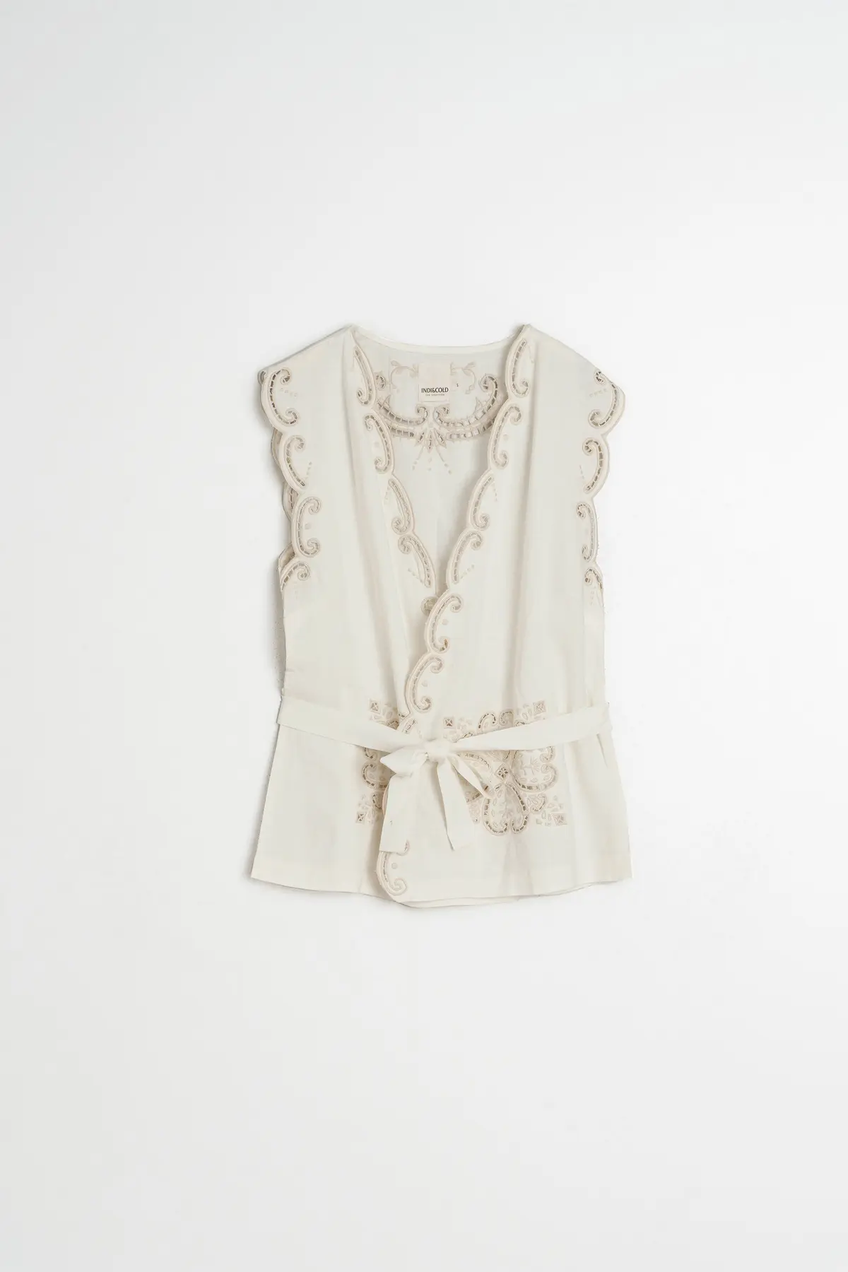Blusa Indi&Cold com detalhes de bordado floral, decote em V profundo, ombros ligeiramente caídos, sem mangas e com acabamento ondulado. Faixa ajustável e removível na cintura.