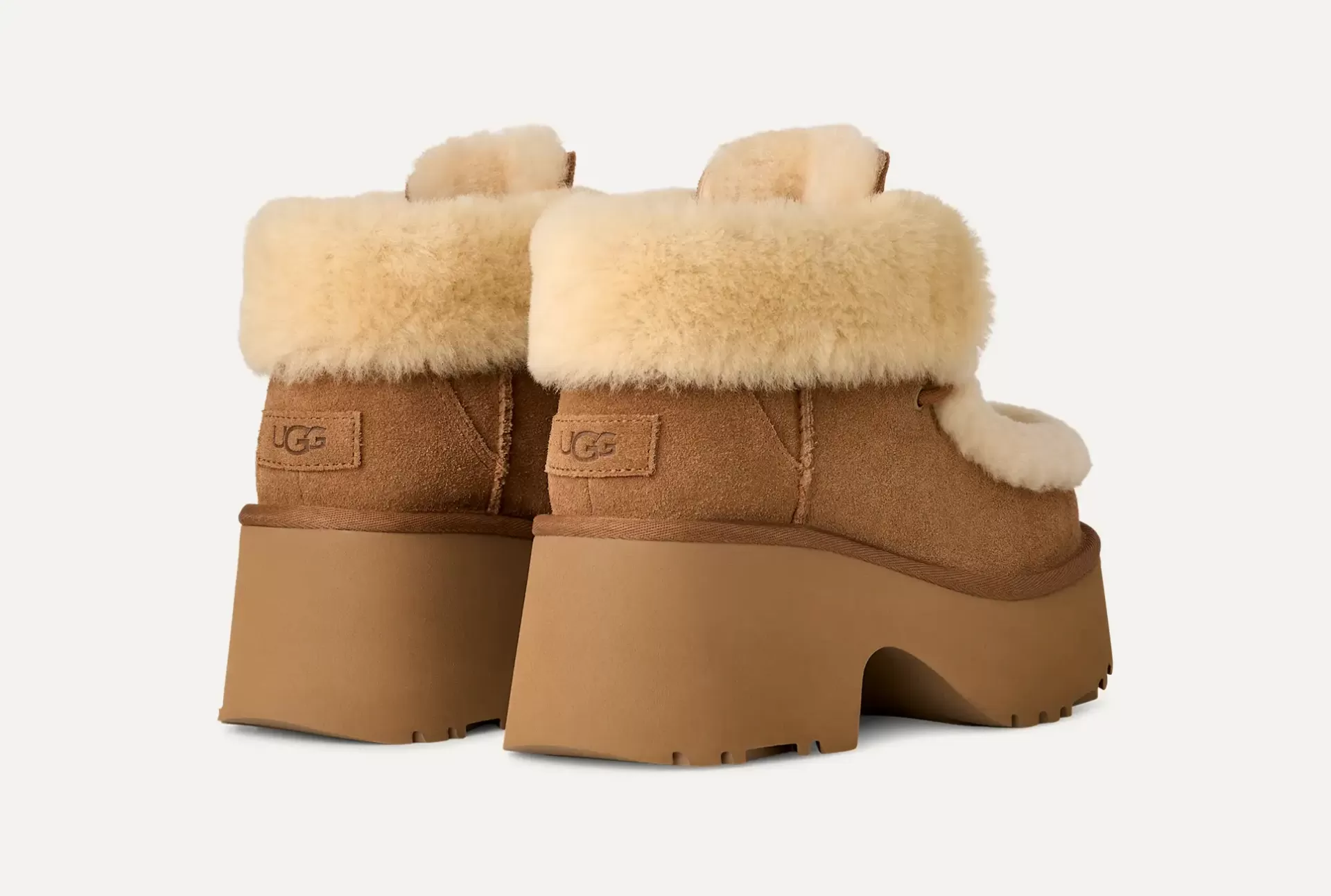 Bota UGG desenhada com cabedal em camurça e uma luxuosa costura vazada em pele de carneiro, possui um colarinho com punho que pode ser dobrado para revelar ainda mais a beleza da pele de carneiro. O interior apresenta um forro macio UGGplush™, enquanto a sola de plataforma de 7,5 cm é feito com EVA de cana-de-açúcar para manter a leveza.