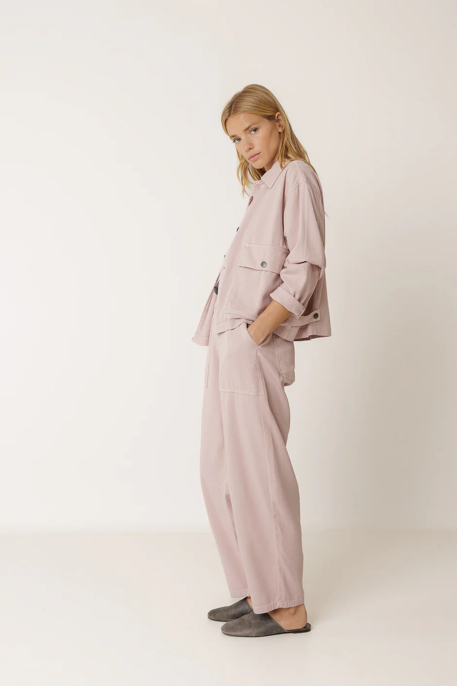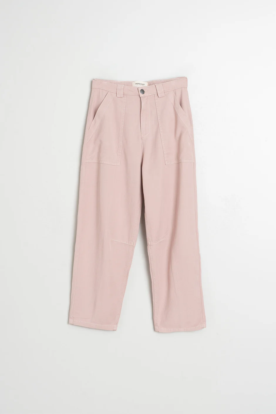 Calça Indi&Cold com bolsos frontais grandes e costura interna no joelho para um efeito balão, cintura alta com cós e passadores de cinto, fecho com zíper e botão e bolsos aplicados e costura central nas costas.