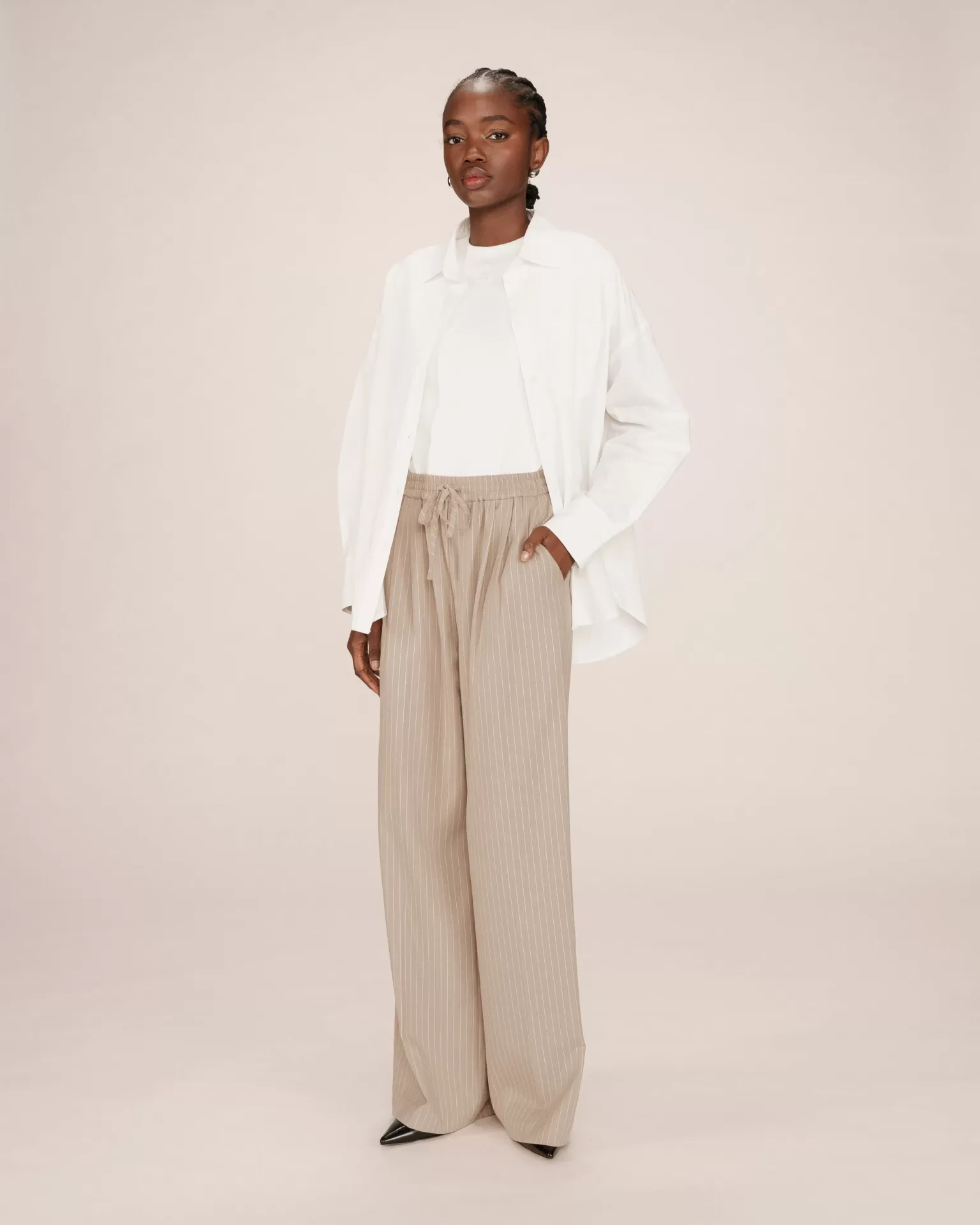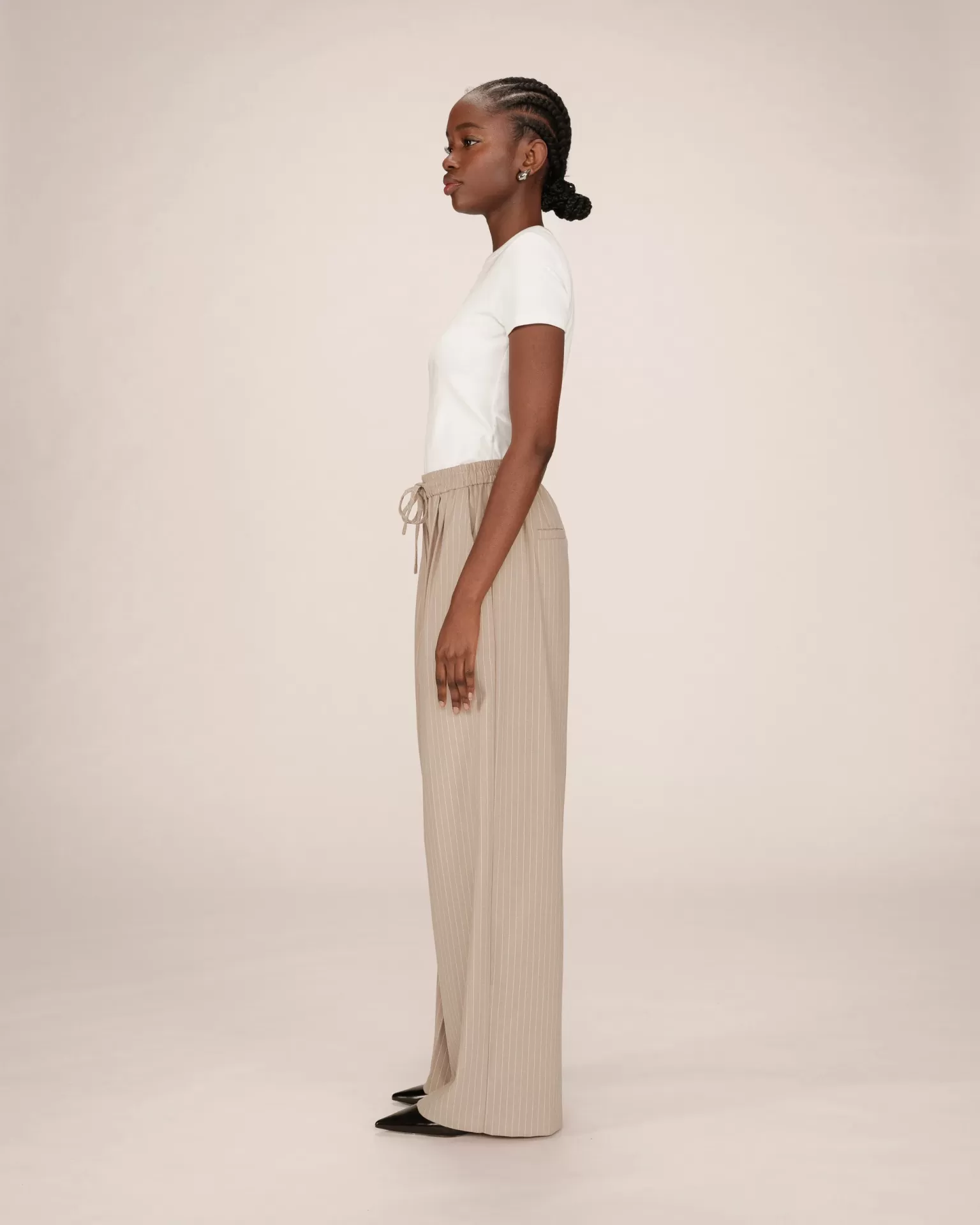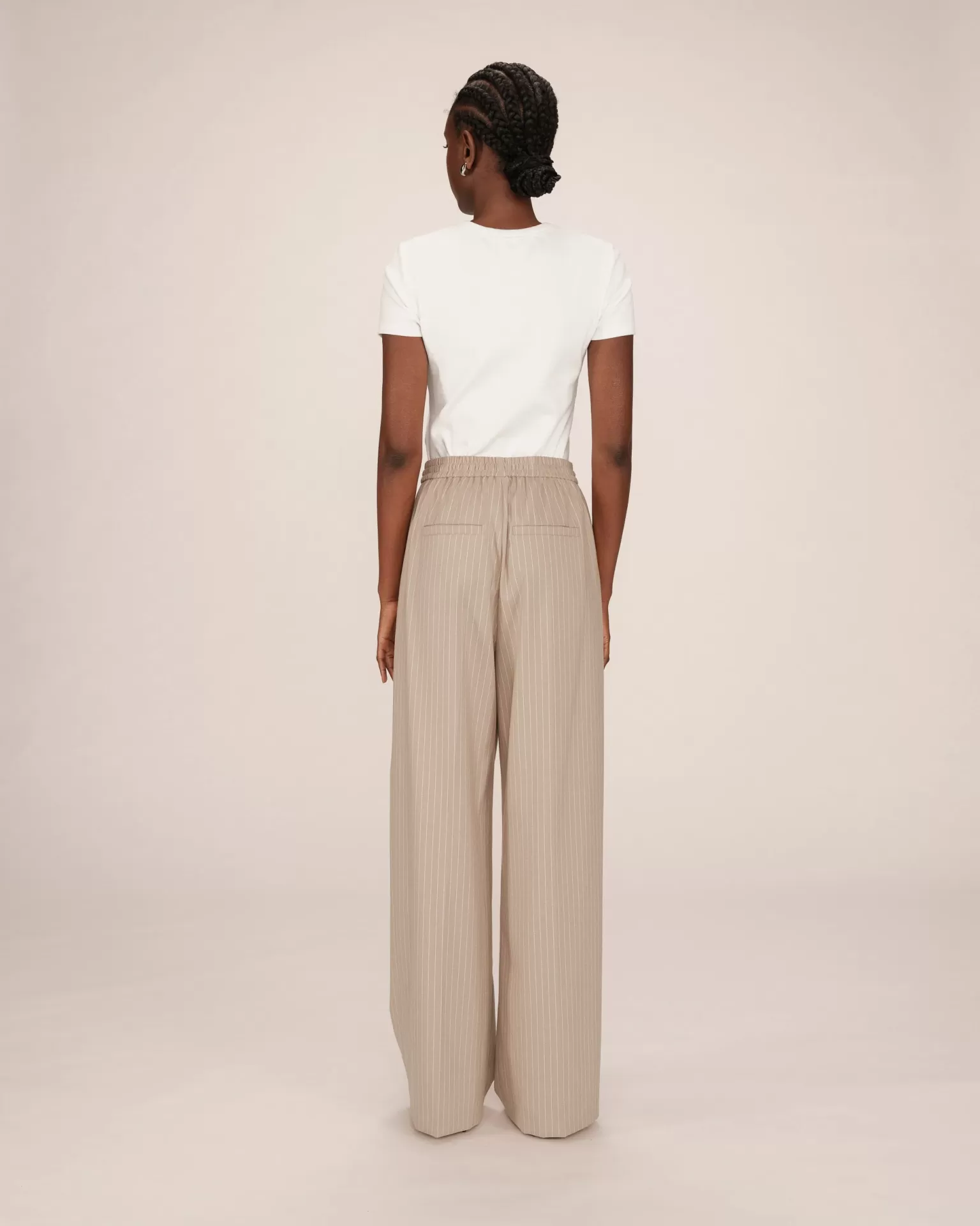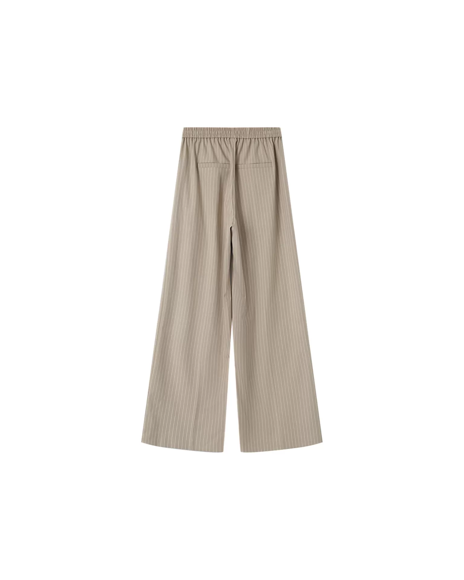 Calça Grace & Mila de alfaiataria listrada, de corte reto com cintura média, cós elástico com cordão, bolsos frontais inclinados e bolsos traseiros embutidos.