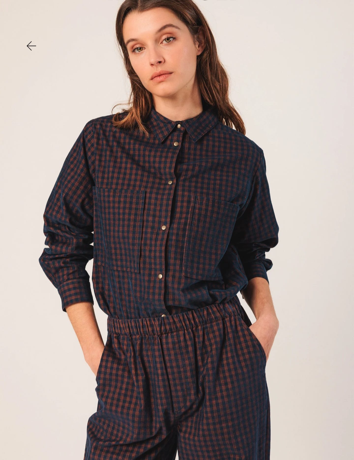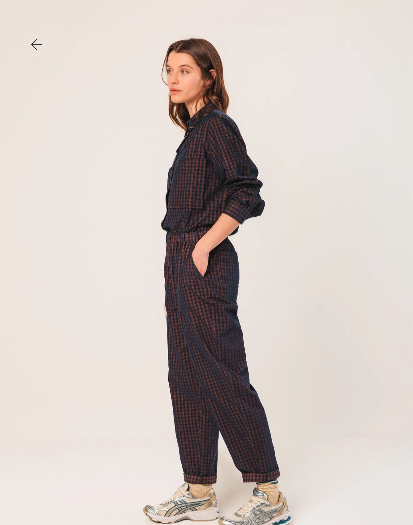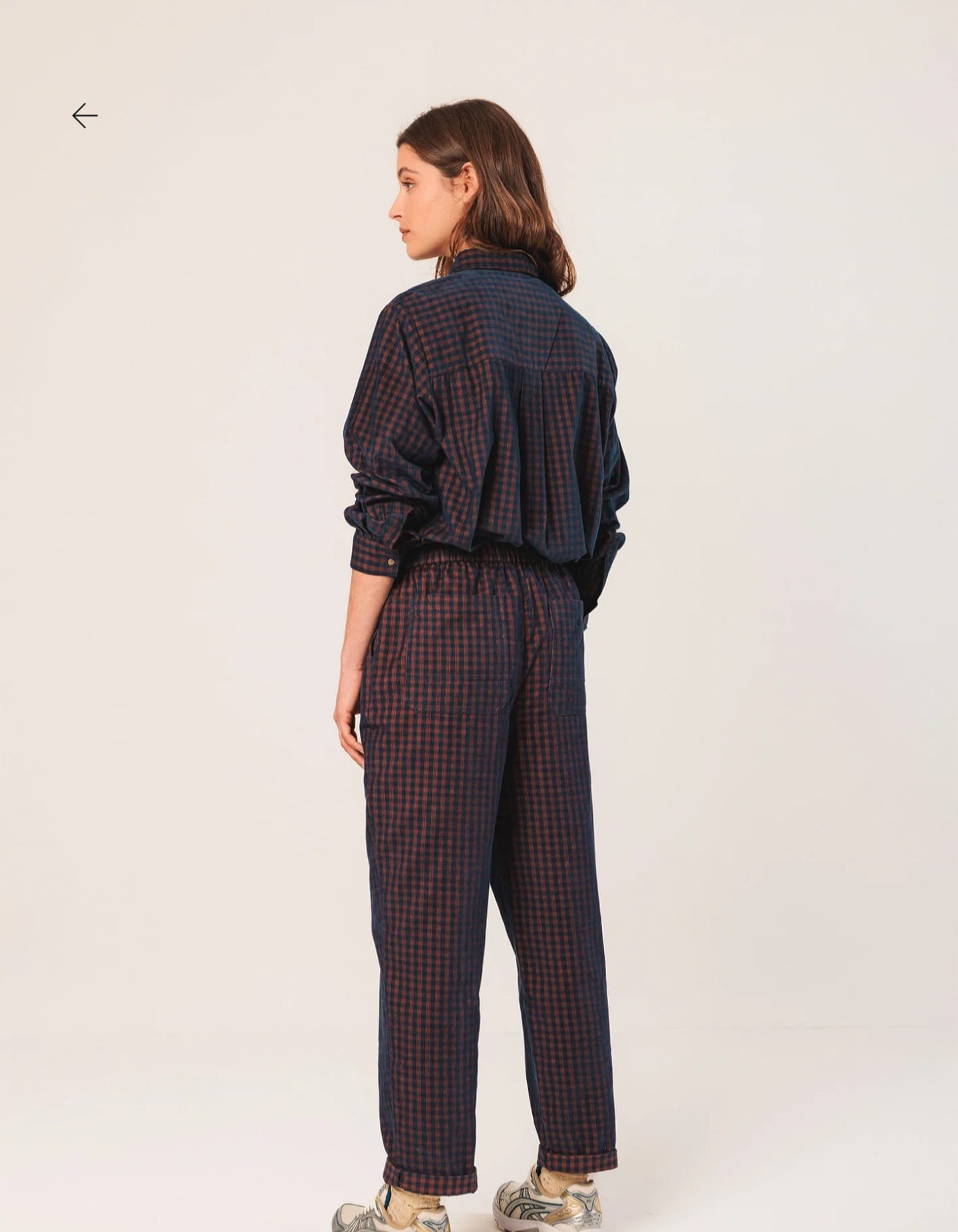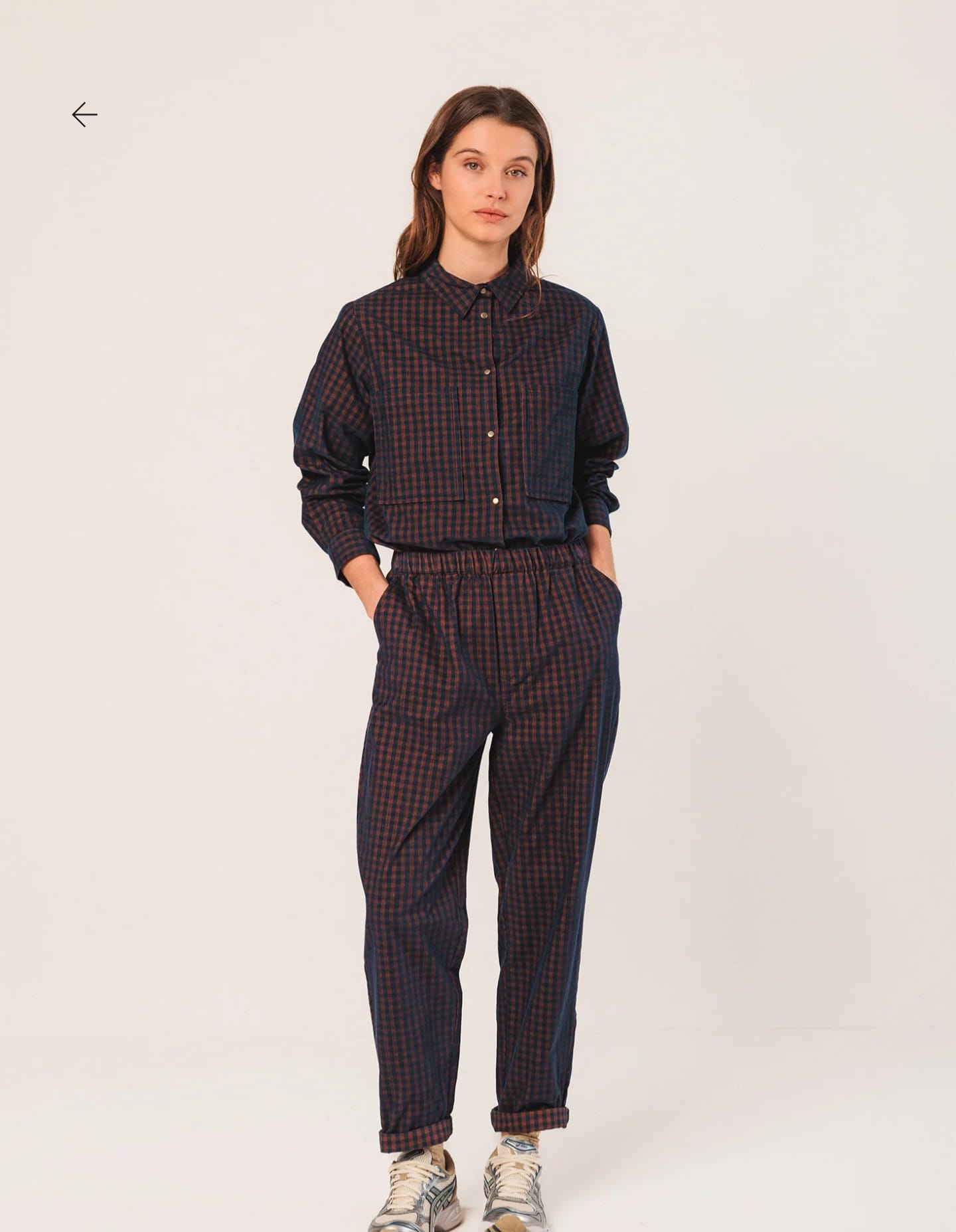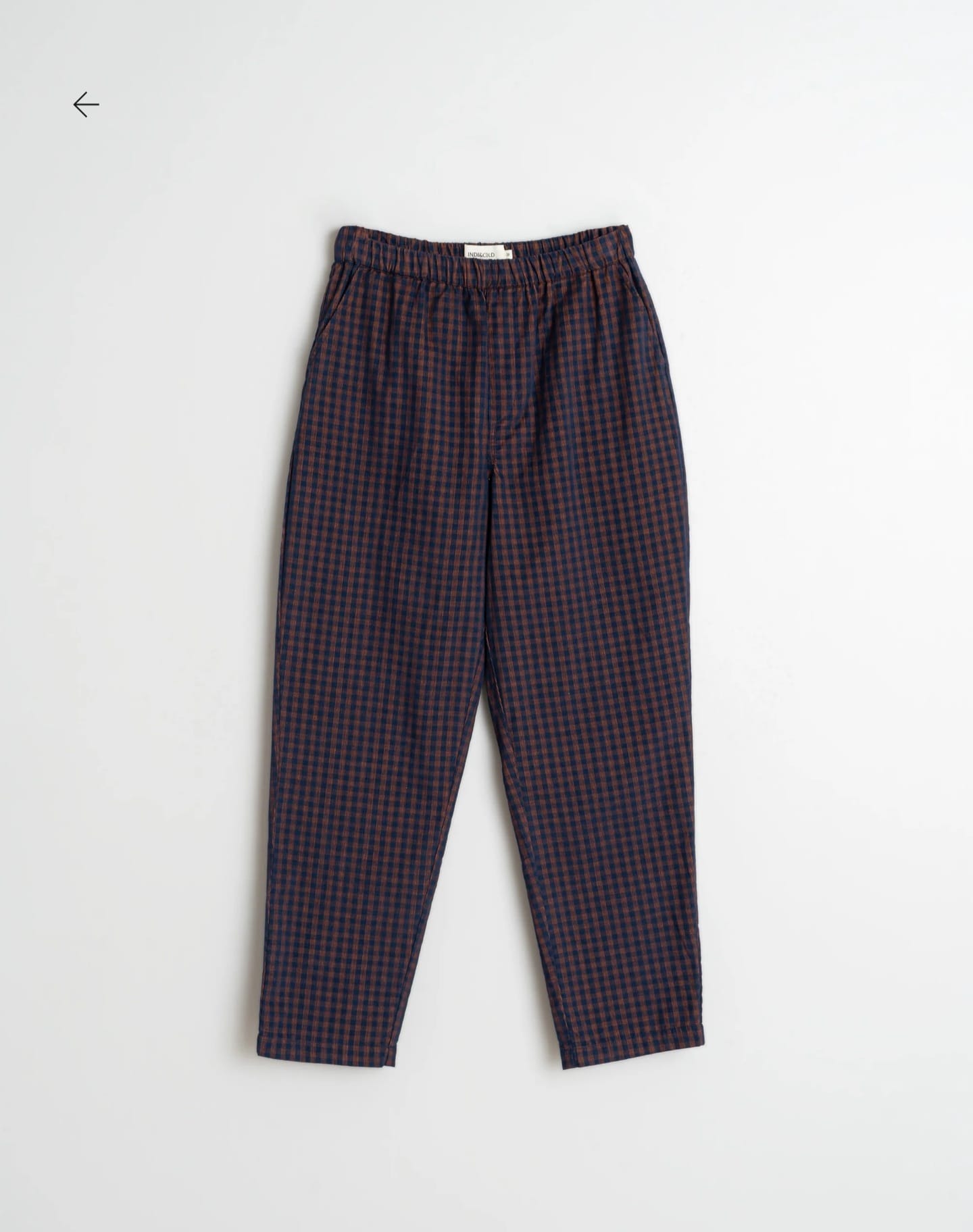 Calça Indi & Cold com padrão vichy de algodão em tecido de microveludo cotelê, cós elástico ajustável, perna larga com ajuste mais justo na bainha, bolsos frontais com corte francês e bolsos traseiros de remendo.