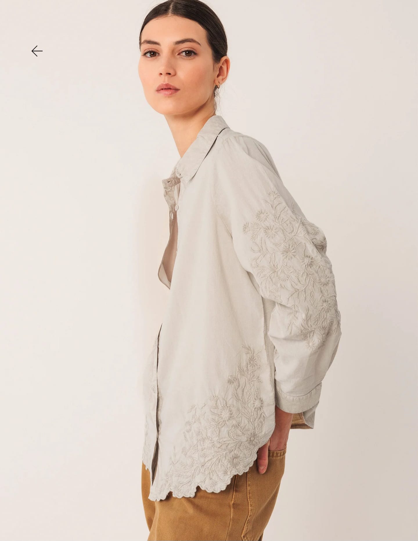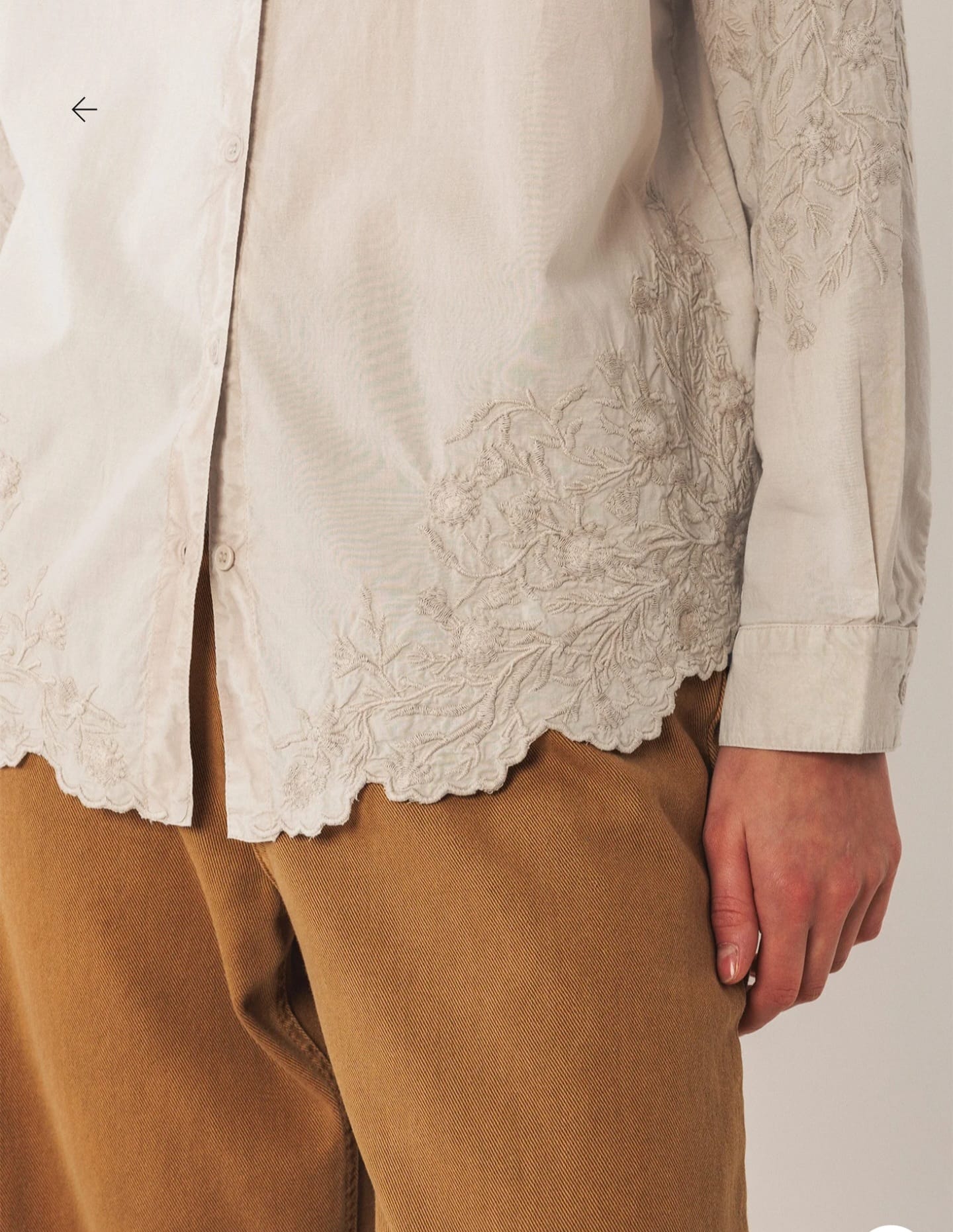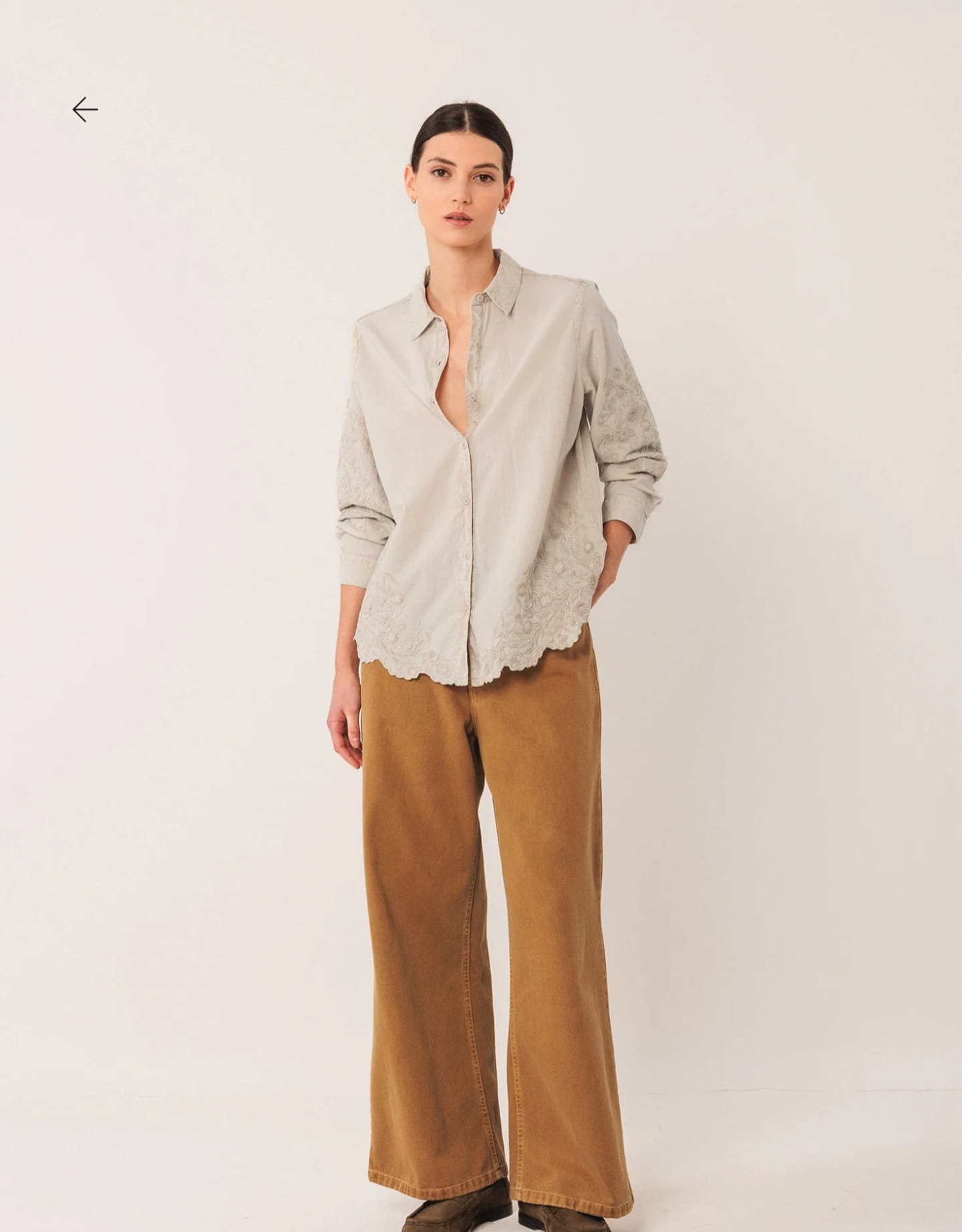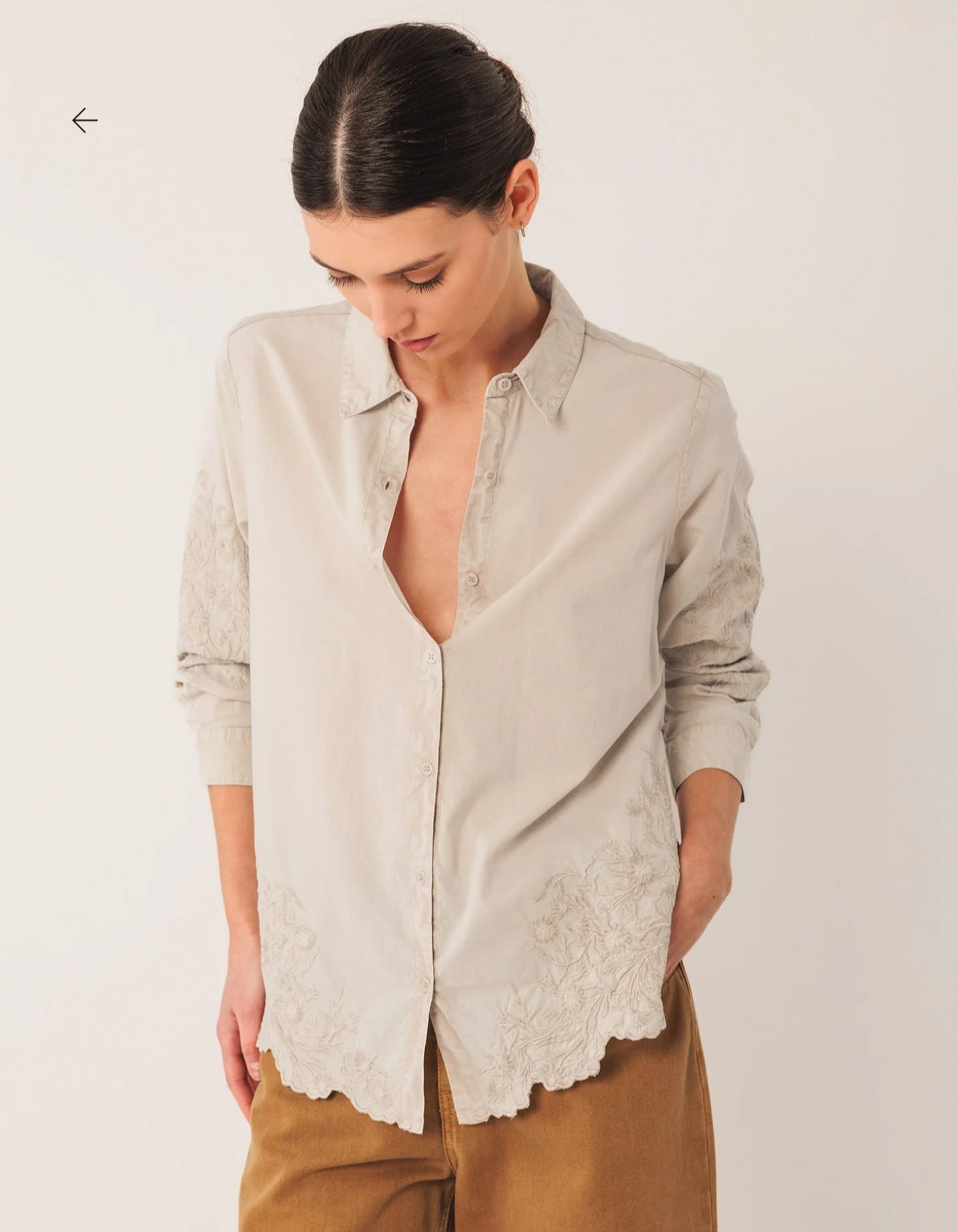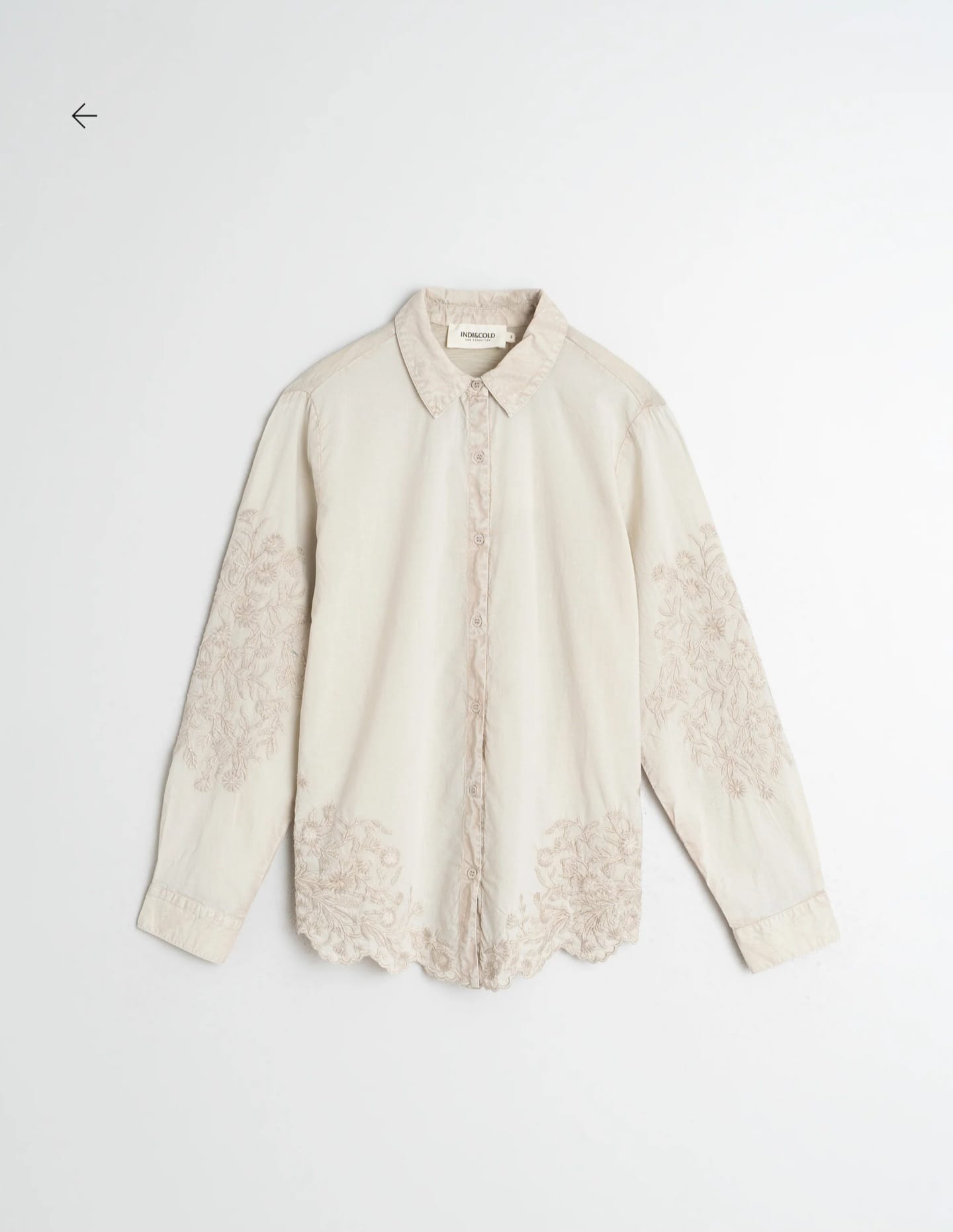 Home Indi & Cold Camisa Bordada -50% Camisa Bordada Cor Pedra Tamanho XS S M L XL 44,95 € 89,90 € Desconto de 50%. Comprar Contactar Adicionar à wishlist INDI. Válido de 20 de Janeiro de 2026 às 00:00 até 28 de Fevereiro de 2026 às 00:00. Ref. INDI&COLD.VI25.AD385 Camisa Indi & Cold com detalhes florais bordados e maga comprida com punho e botão. Medidas no tamanho S: Comprimento do ombro: 65 cm. Largura do peito: 52 cm. Largura da parte inferior: 55 cm. Tamanho: +1 cm de comprimento por tamanho e +2 cm nos contornos. Composição: 100% Algodão Partilhar
