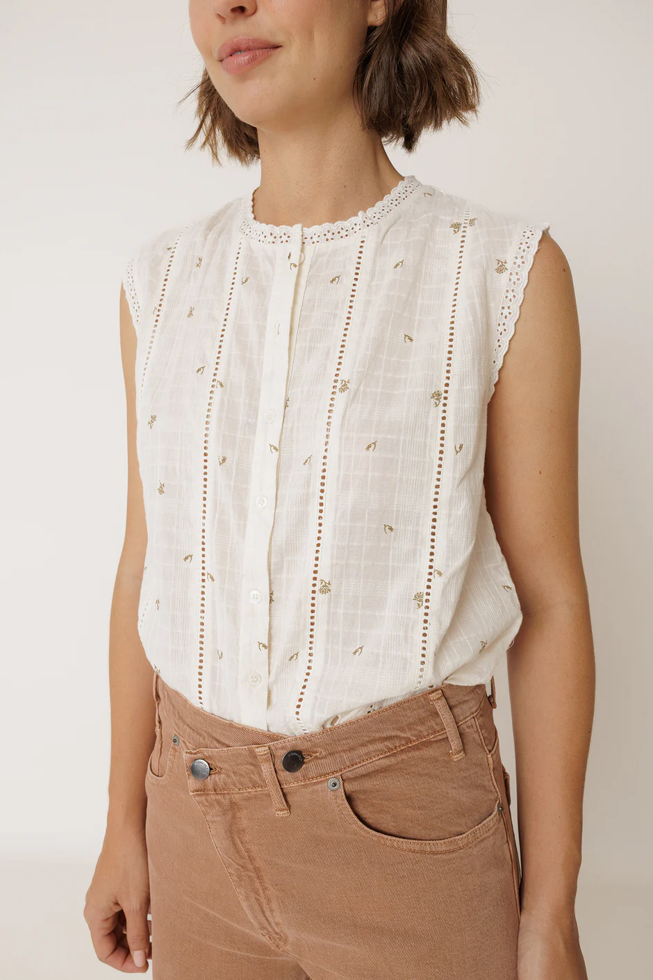 Camisa Indi&Cold com estampa floral e detalhes bordados com motivos florais recortados na barra, gola redonda e ombros ajustados com acabamento em renda. •