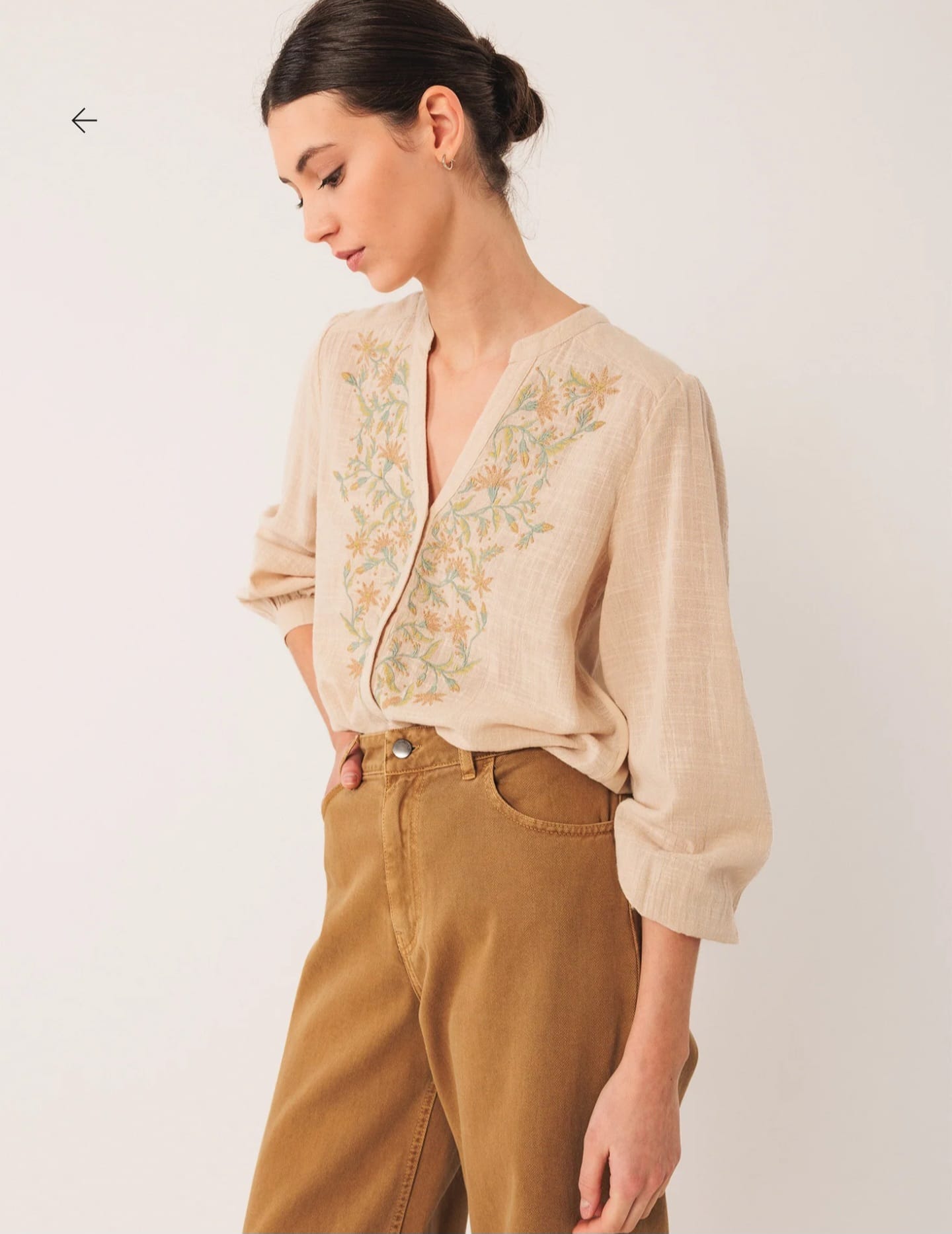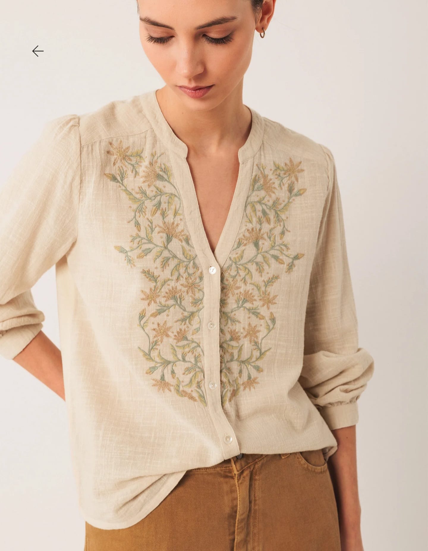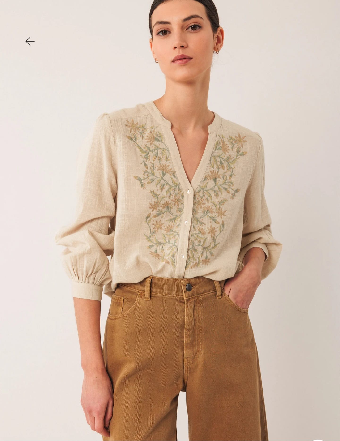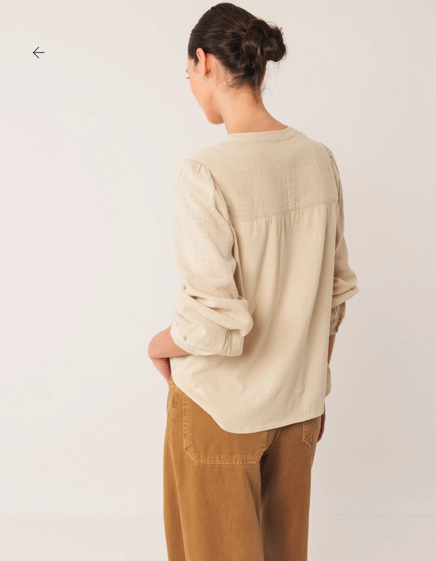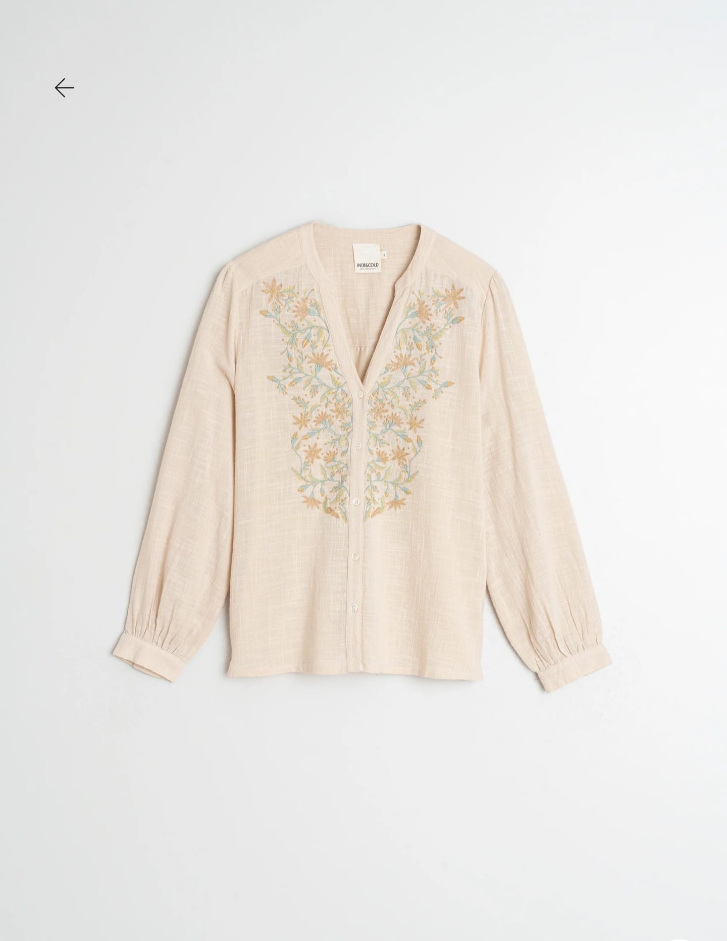 Camisa Indi & Cold com combinação de jersey e tecido de algodão sustentável, gola redonda terminando em V e fecho frontal com botões, ombros ajustados e mangas compridas com punhos e botão.