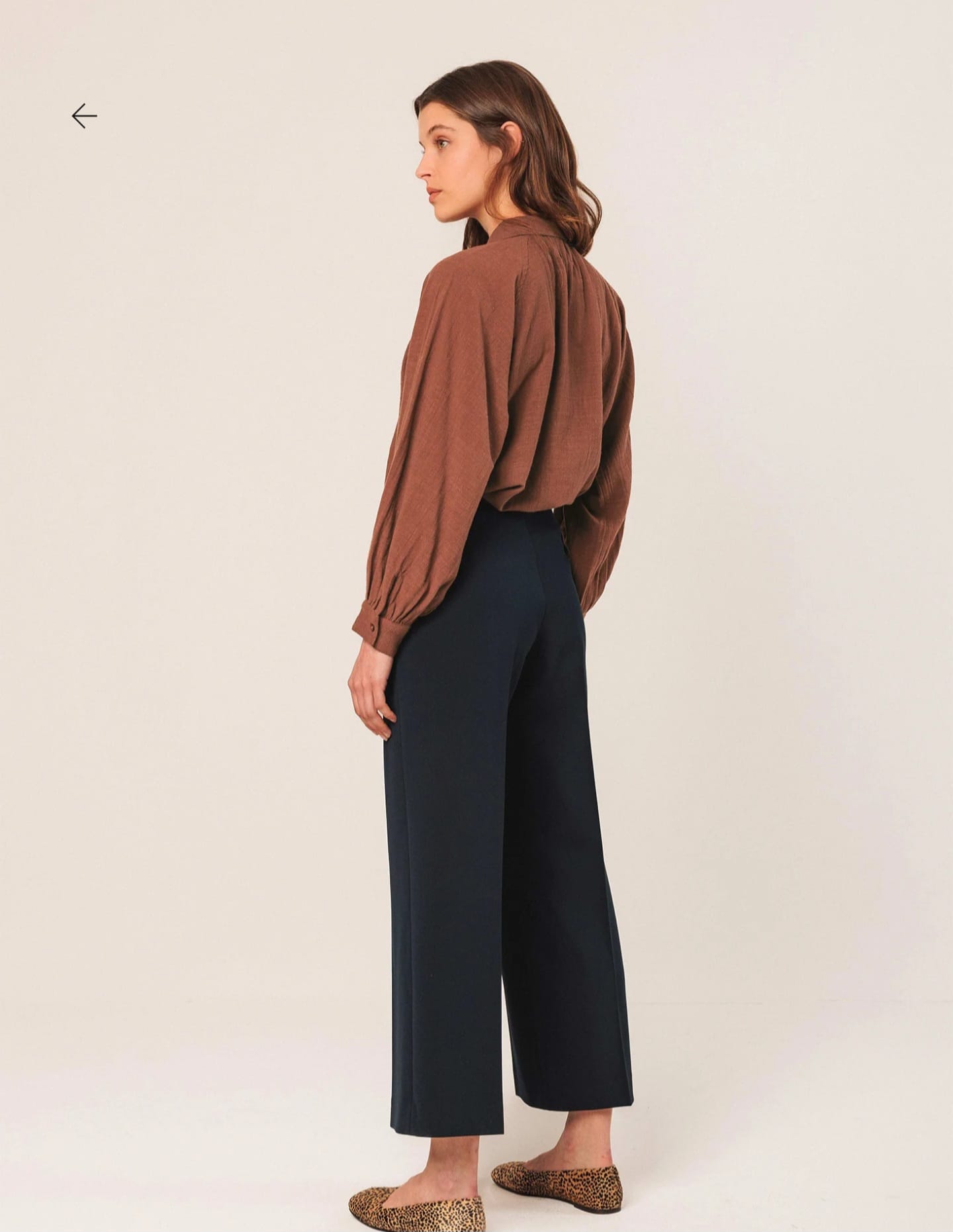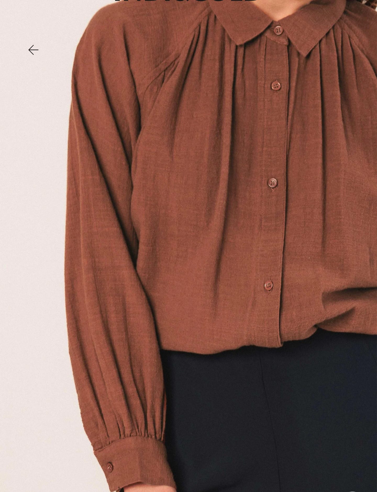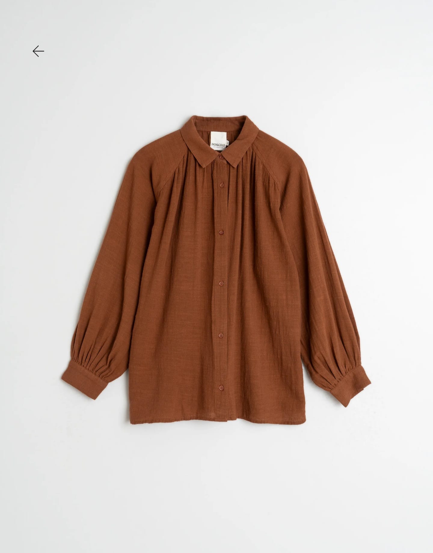 Camisa Indi & Cold de modelo oversize, com gola, franzida no pescoço para dar amplitude à peça, ombro com corte raglan, manga comprida balão com punho e botão.