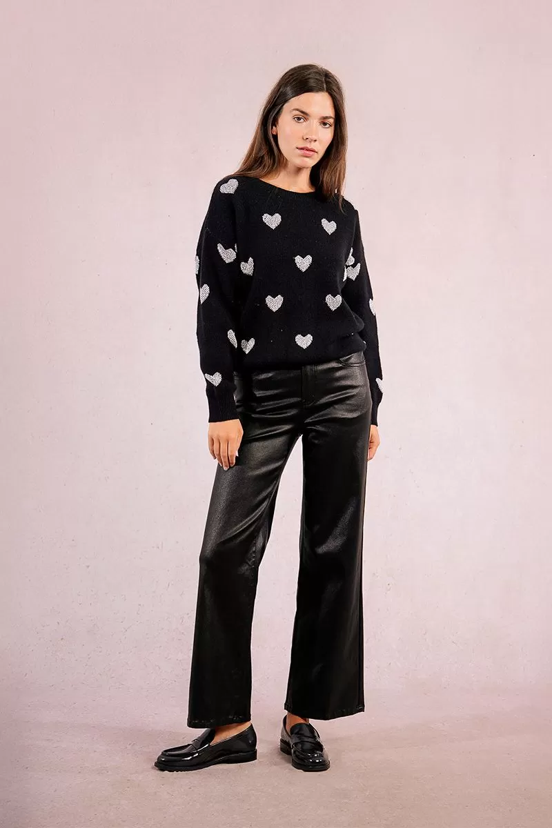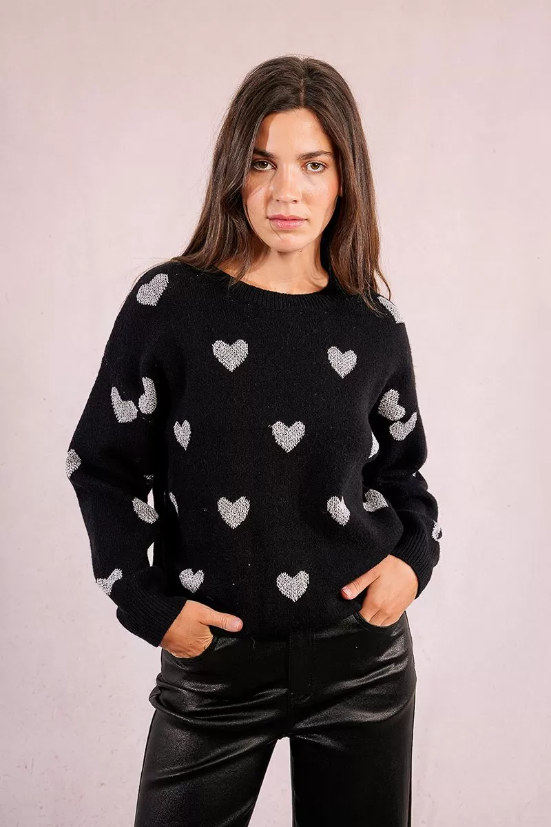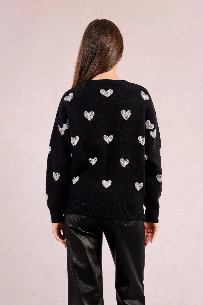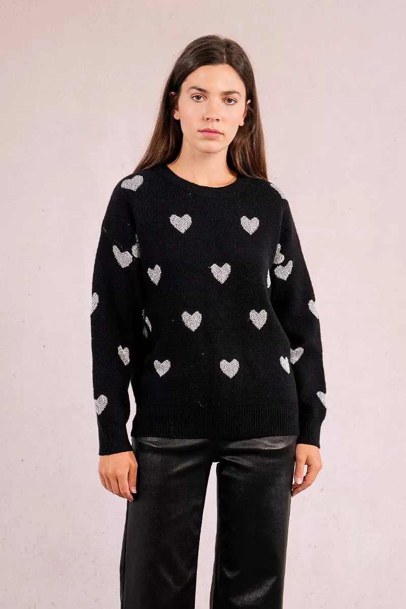 Camisola Molly Bracken em tricô com estampa de corações brilhantes, gola, punhos e bainha canelados, decote redondo ombros caídos e mangas compridas com punhos.