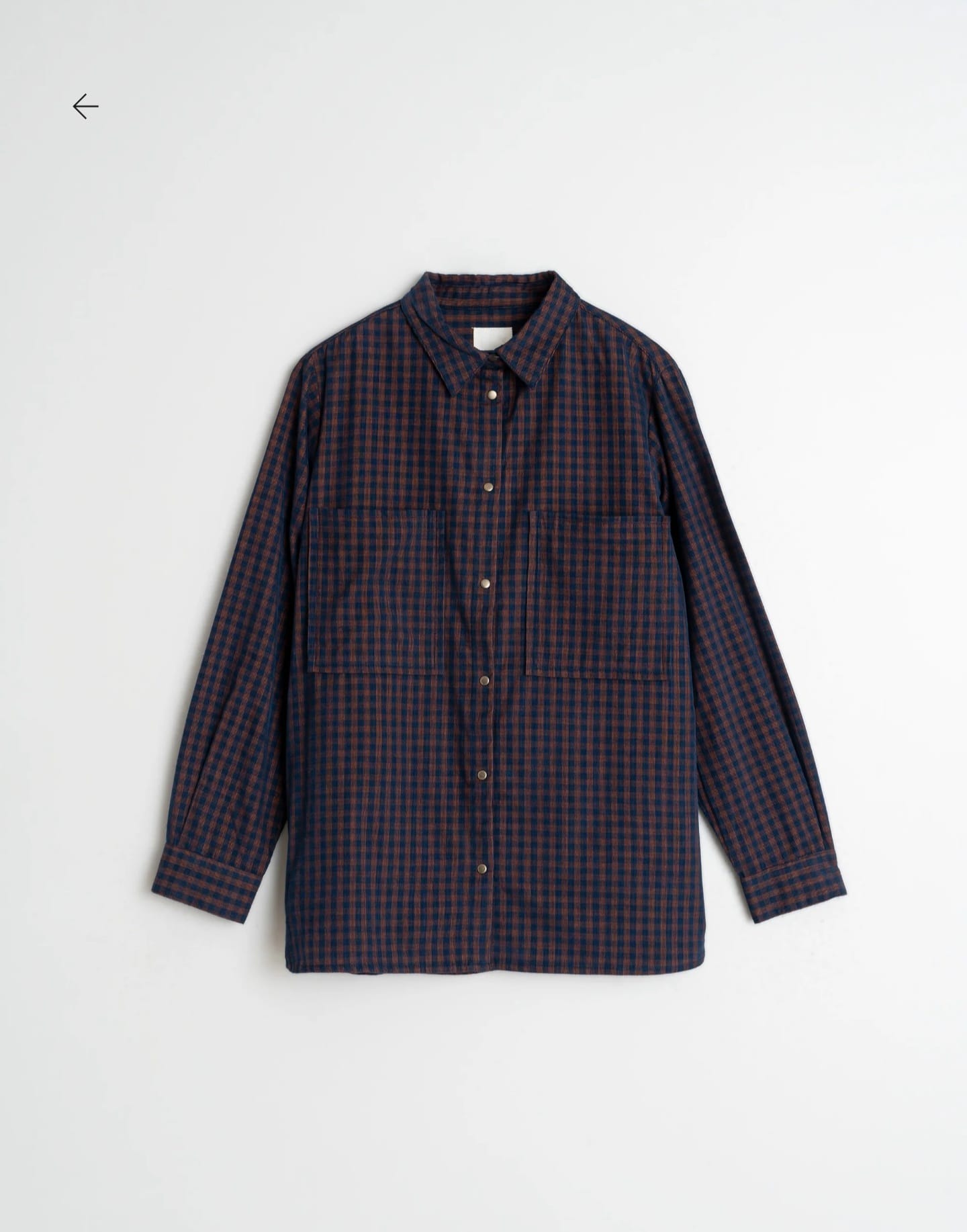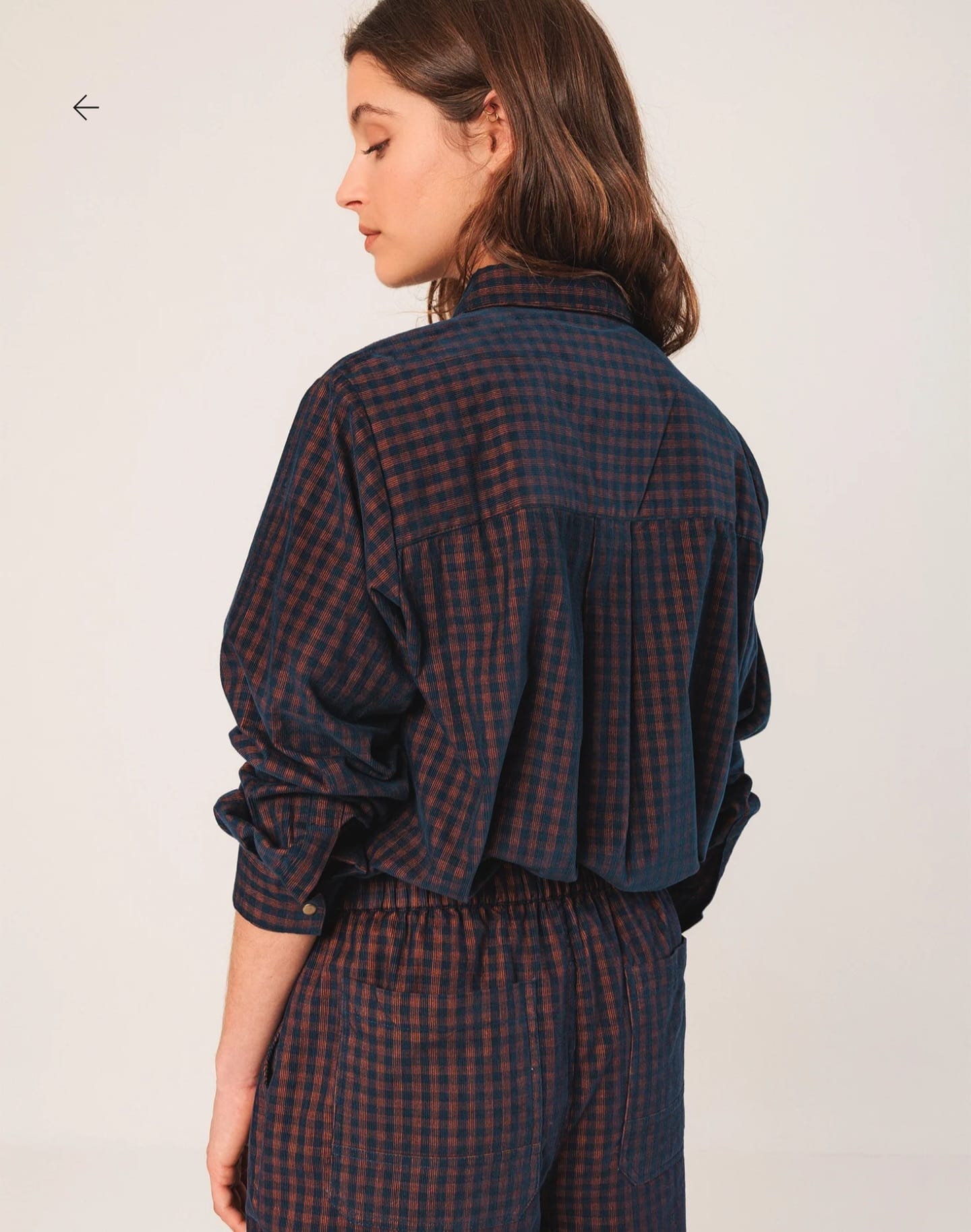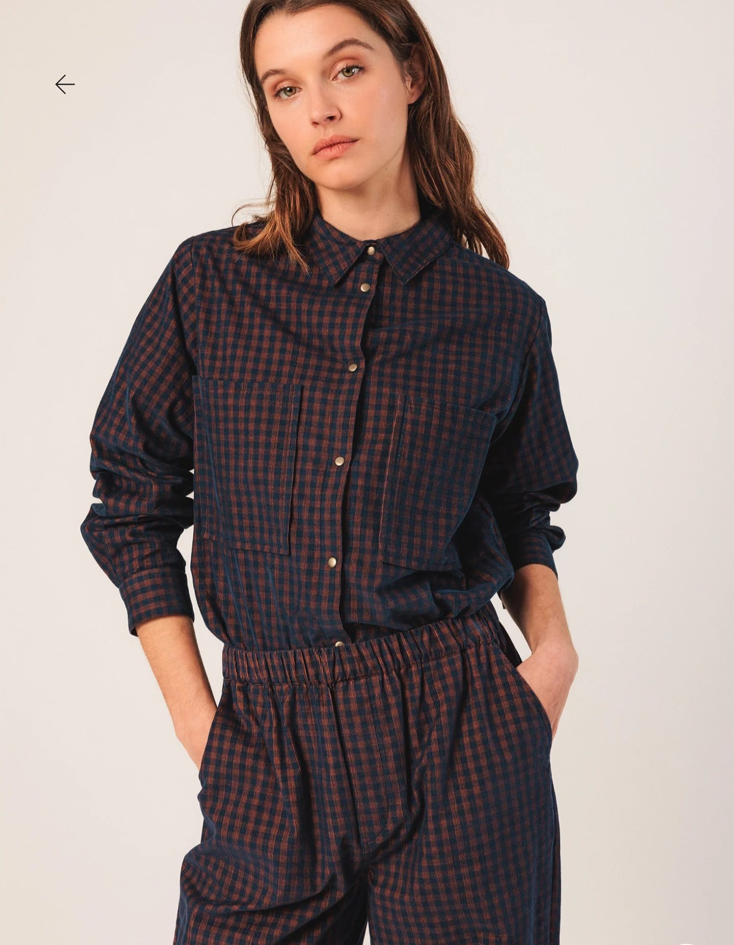Camisa Indi & Cold em tecido de microveludo cotelê com padrão vichy, botões de pressão na frente e bolsos superiores, gola tipo camisa, ombros ajustados e mangas compridas com punho e botão de pressão.
