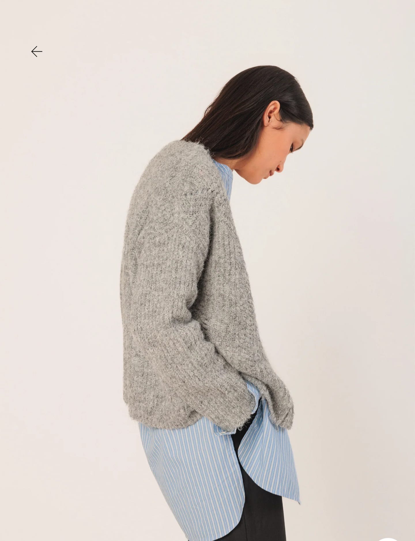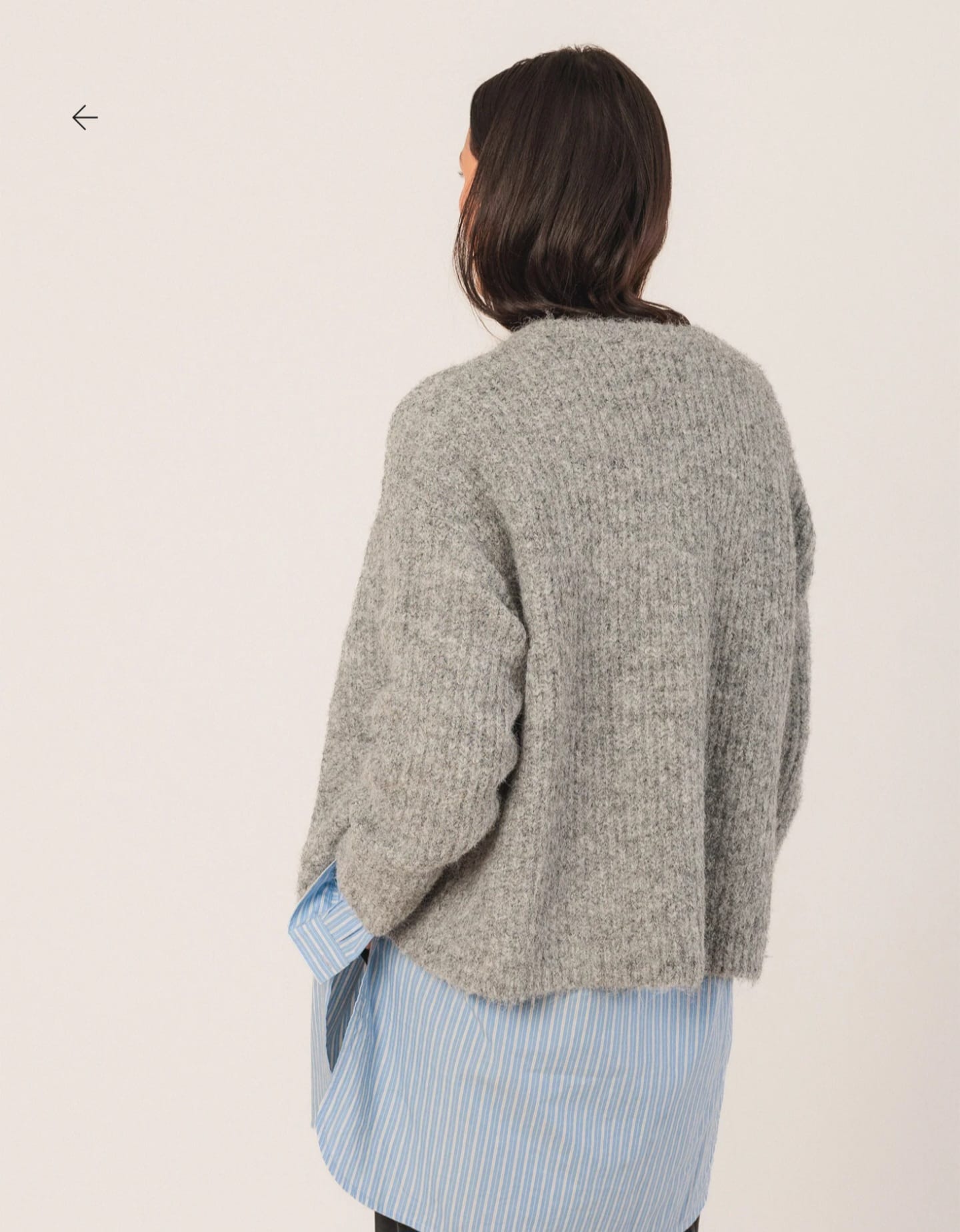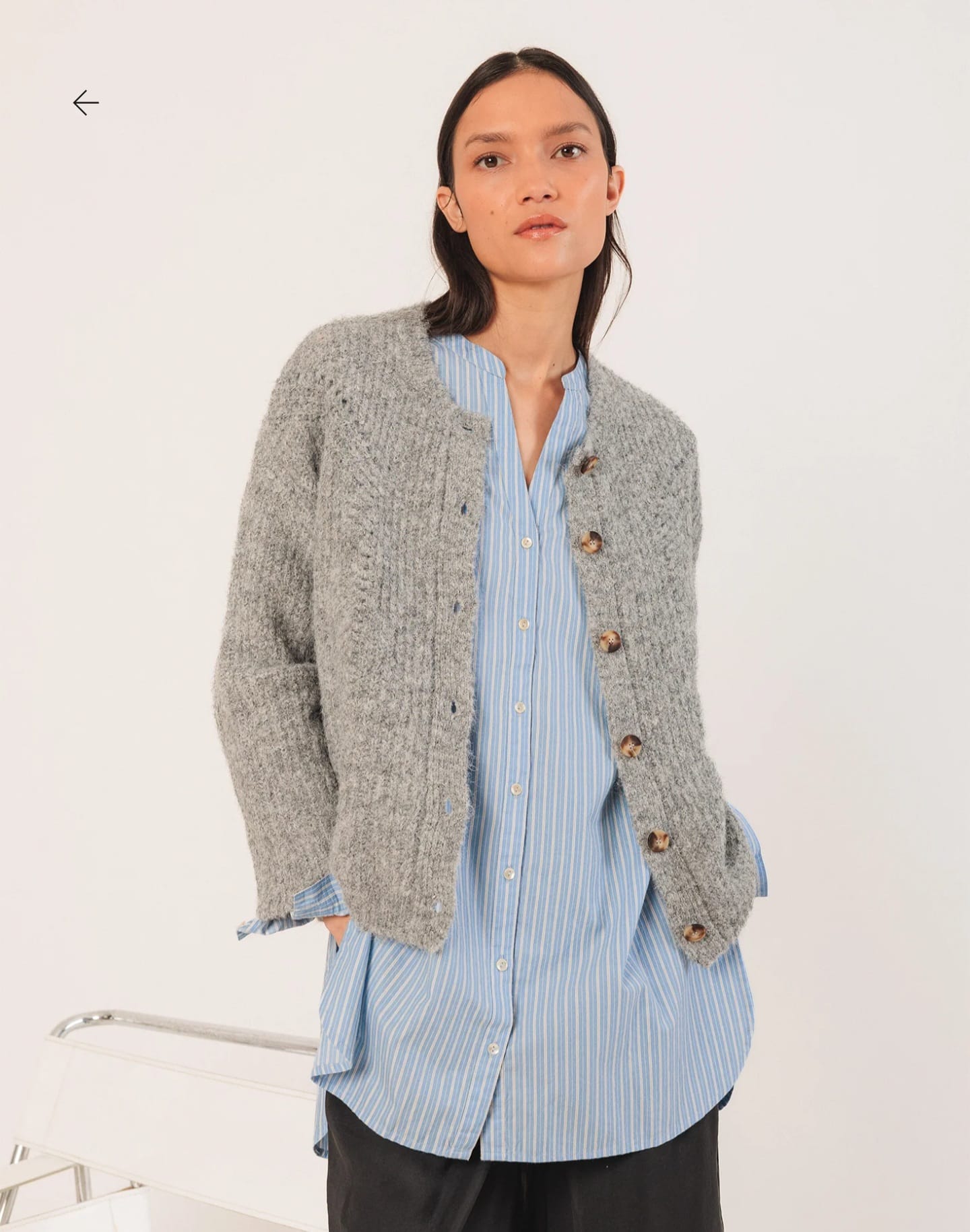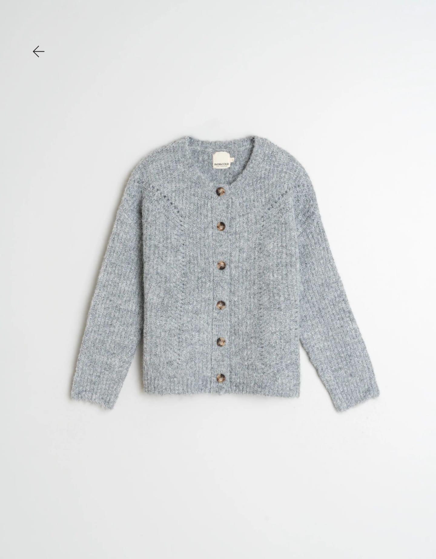 Home Indi & Cold Casaco Bianca Casaco Bianca Cor Cinza Aloe Tamanho XS M 89,90 € Desconto de %. Comprar Contactar Adicionar à wishlist Ref. INDI&COLD.VI25.RD451 Casaco Indi & Cold em malha com detalhes, gola redonda canelada, ombros caídos e mangas compridas. Medidas no tamanho S: Comprimento do ombro: 55 cm. Largura do peito: 53 cm. Largura da parte inferior: 53 cm. Tamanho: +1 cm de comprimento por tamanho e +2 cm nos contornos. Composição: 59% Poliéster reciclado 21% Poliamida 11% Poliéster 8% Lã 1% Elastano Partilhar