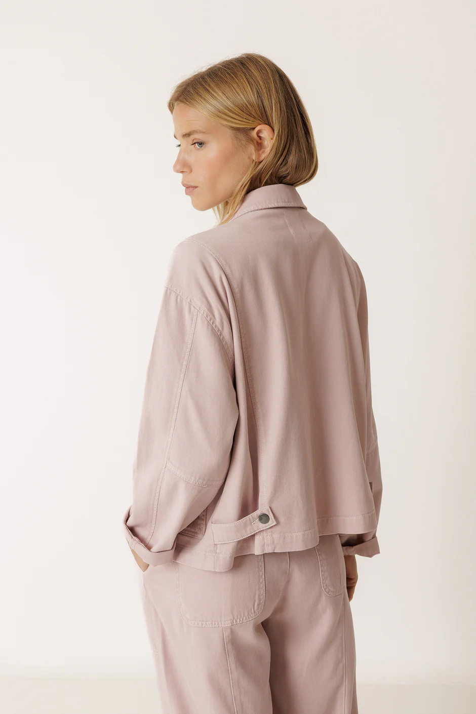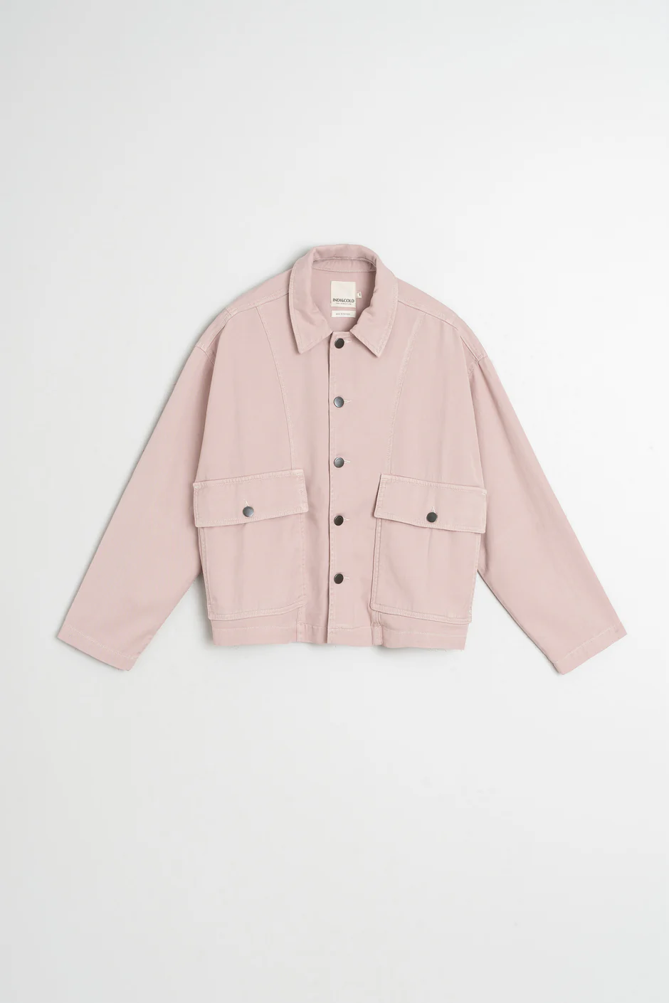 Casaco Indi&Cold de modelo folgado com aba ajustável com botão nas costas,  gola de camisa, ombros ligeiramente caídos, mangas compridas e bolsos frontais grandes.