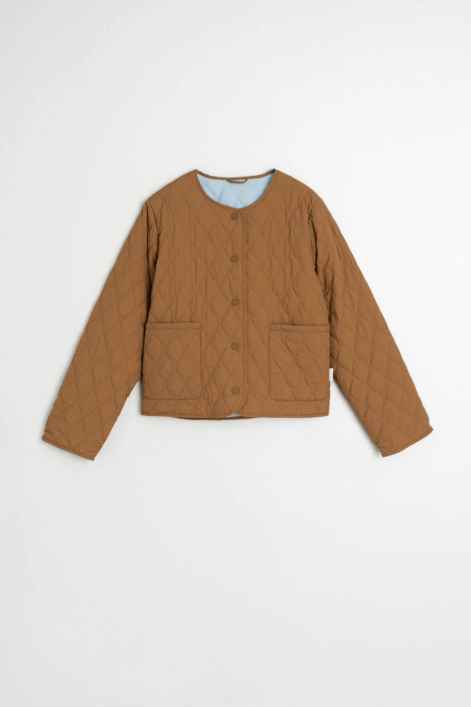 Casaco Indi&Cold em tecido acolchoado reversível com padrão de losangos, decote redondo sem lapelas e mangas compridas e retas. Saco de armazenamento dobrável combinando.
