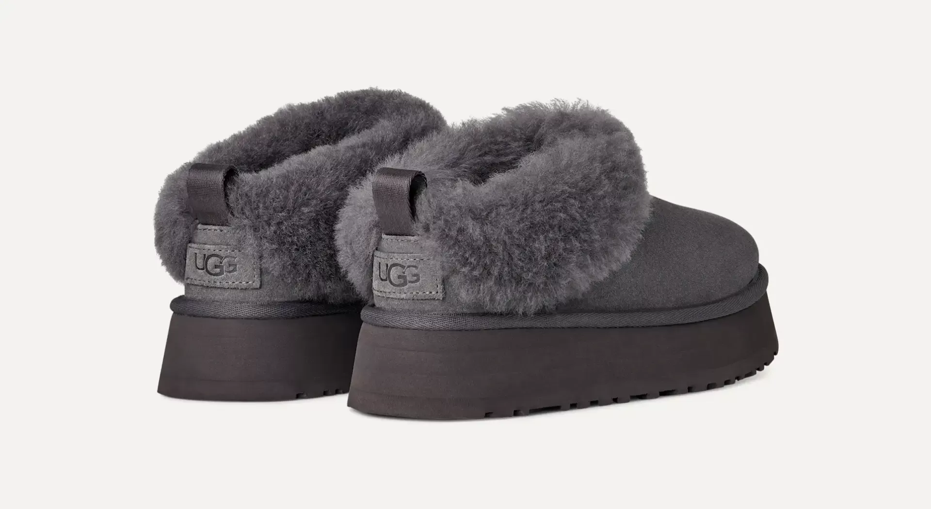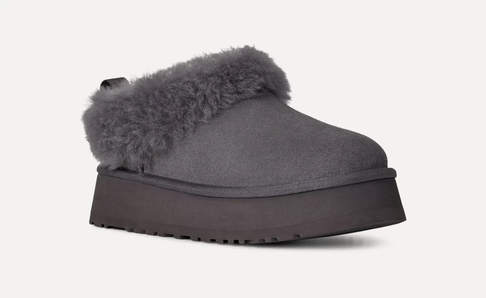 Chinelo UGG em camurça genuína e uma plataforma leve de 4,5 cm feita de EVA elástico de cana-de-açúcar. A pele de carneiro reveste o interior e continua no punho fixo luxuoso.