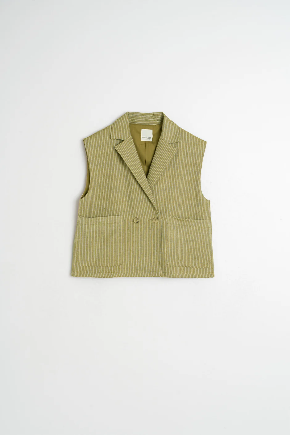 Colete Indi&Cold em tecido de algodão listrado, gola com lapela e fecho duplo com botões, ombros ligeiramente caídos e sem mangas e bolsos grandes na frente.