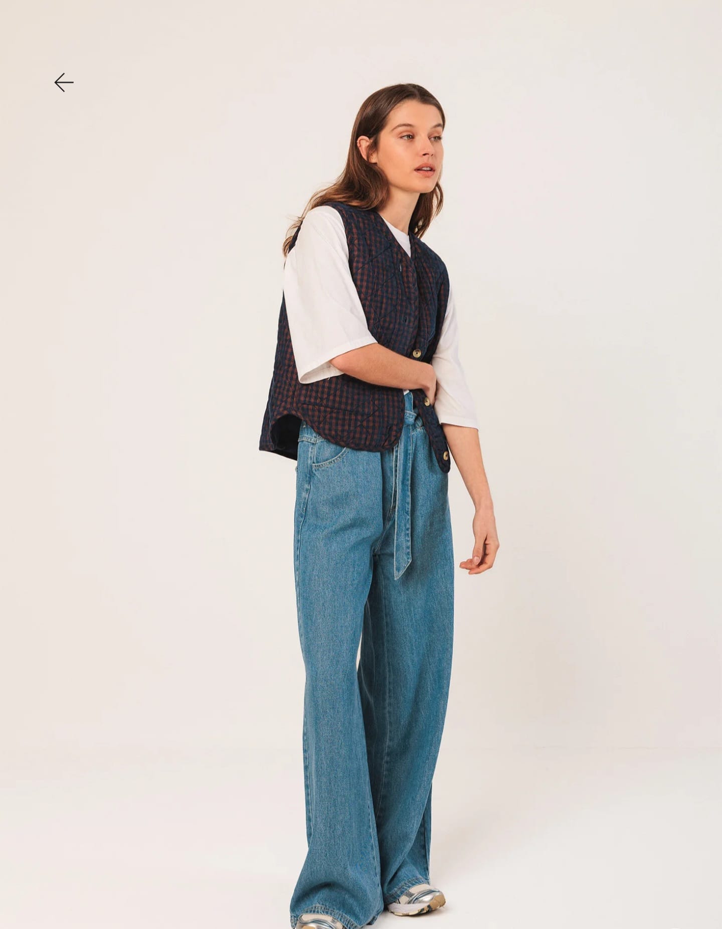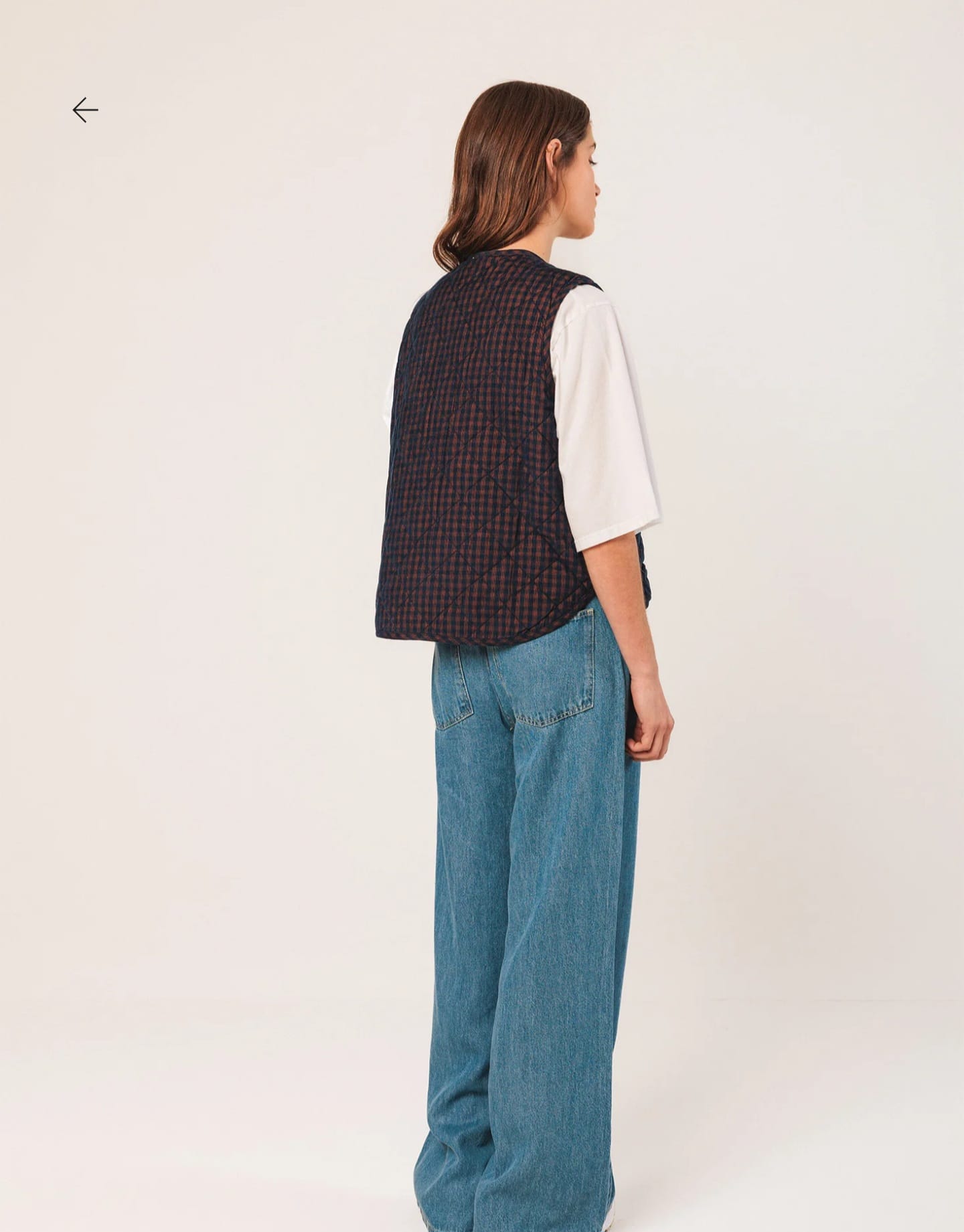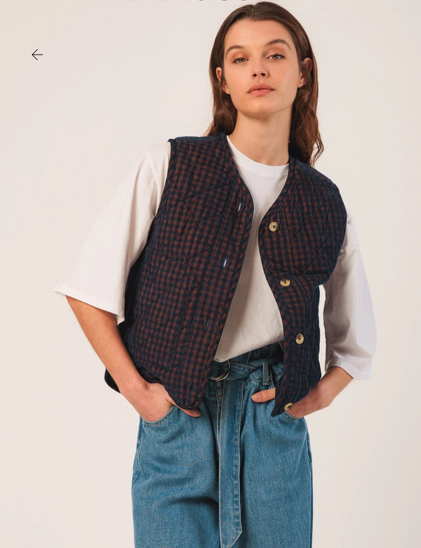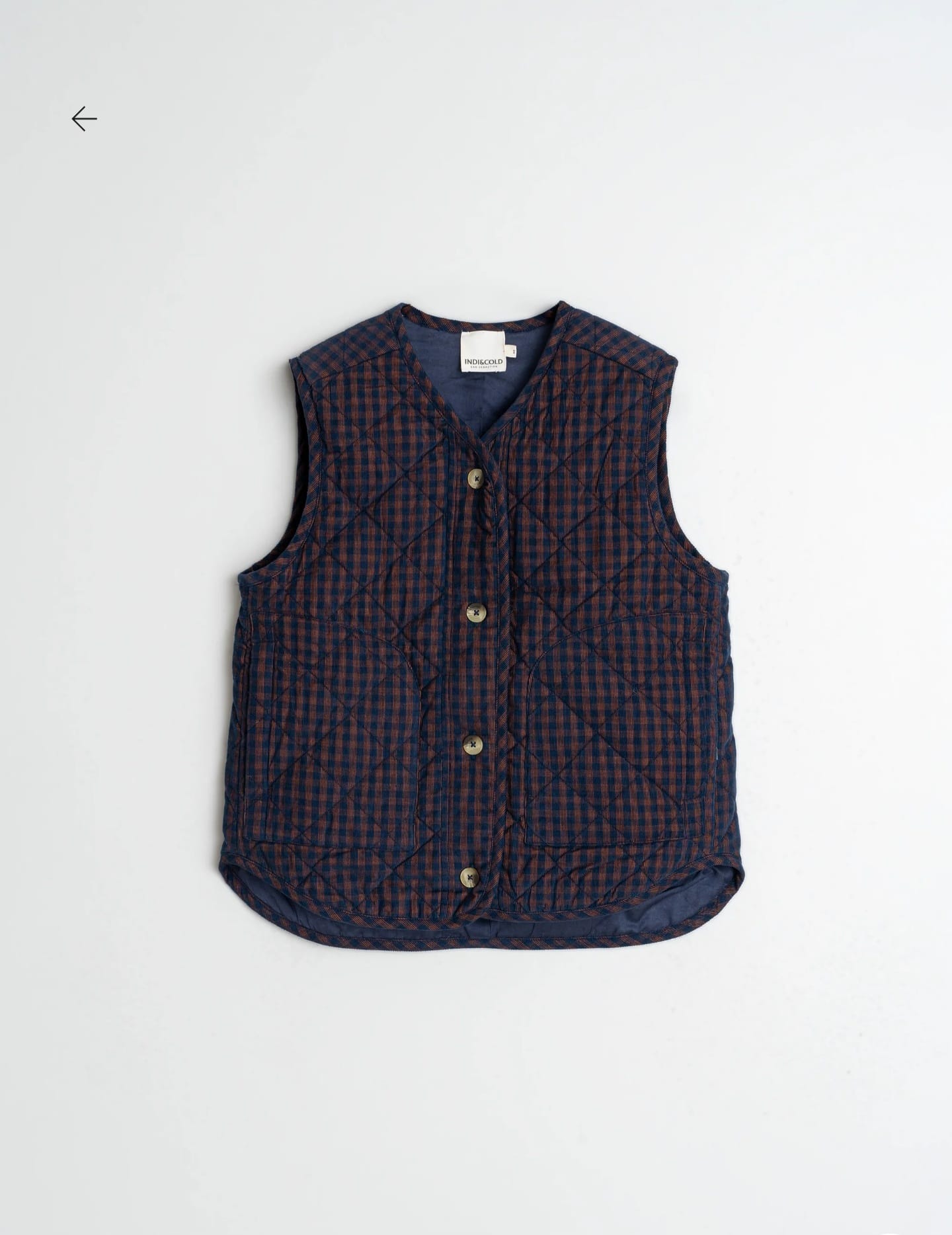 Colete Indi & Cold em padrão vichy de algodão em tecido de microveludo cotelê, ombro reto com ombreiras, fecho de botão, bolsos de aplicação com abertura lateral.