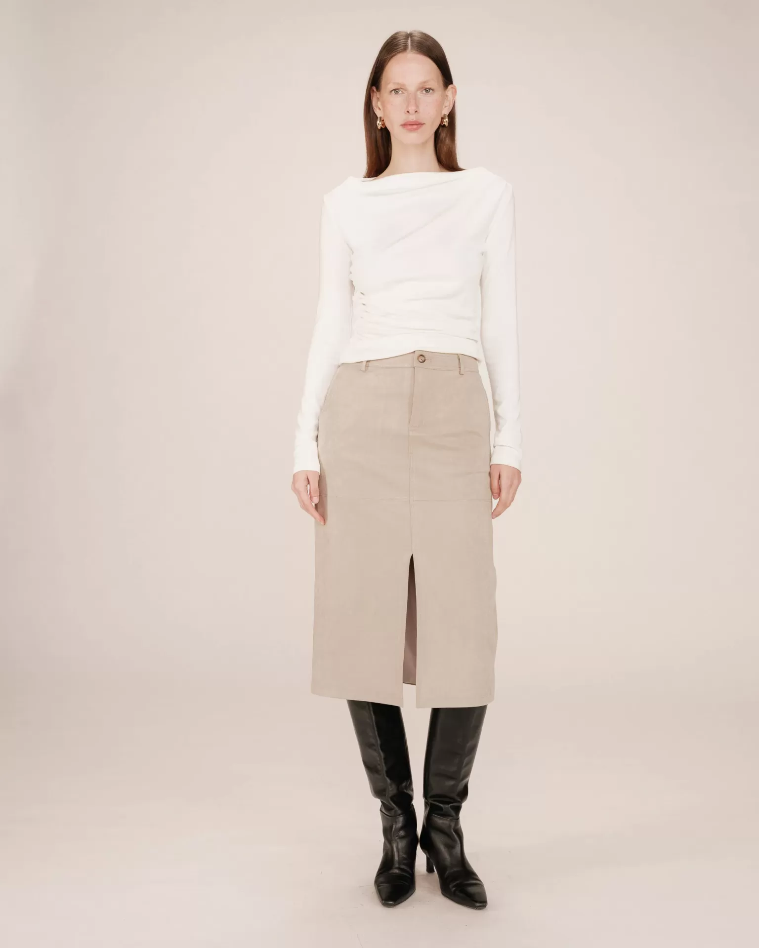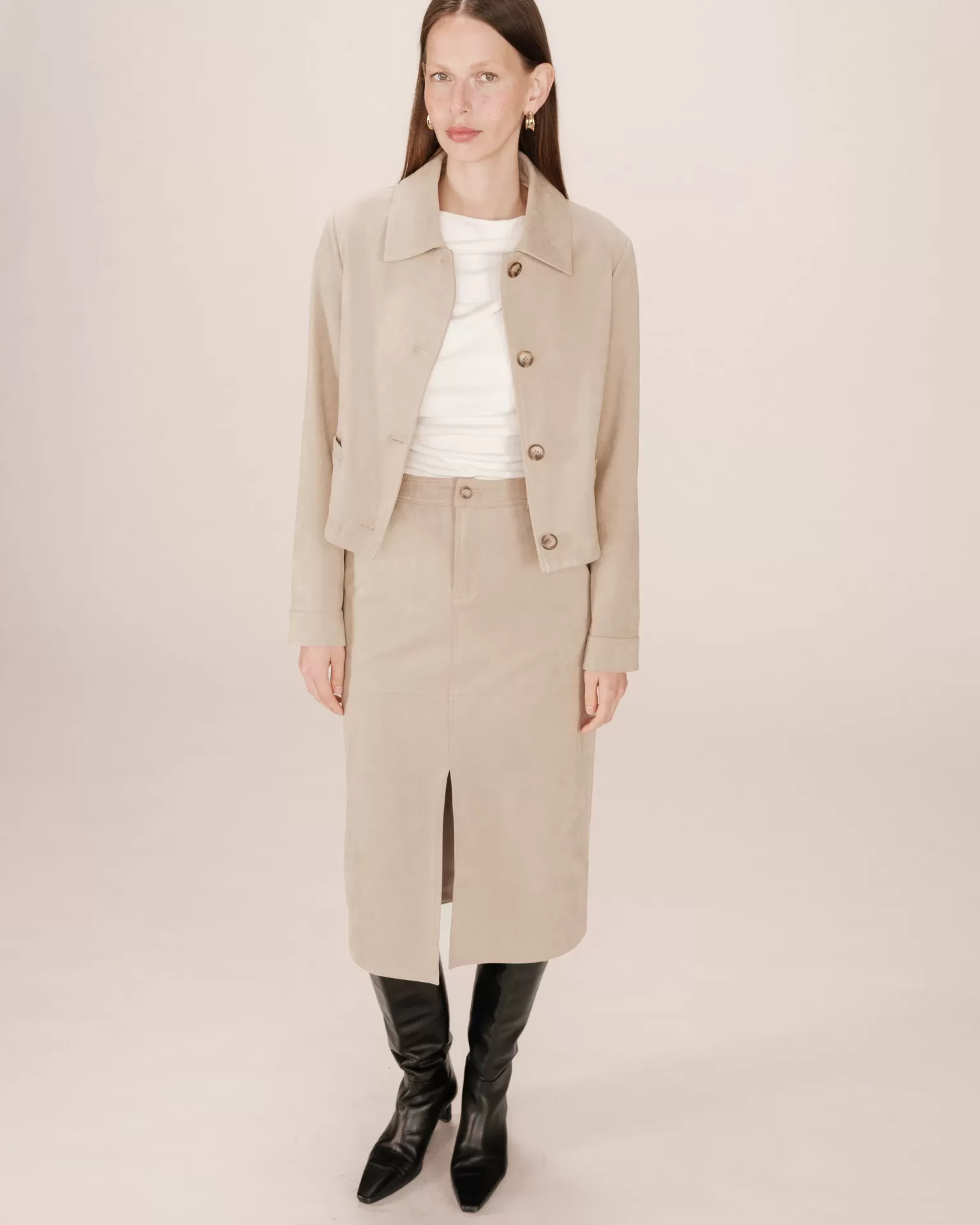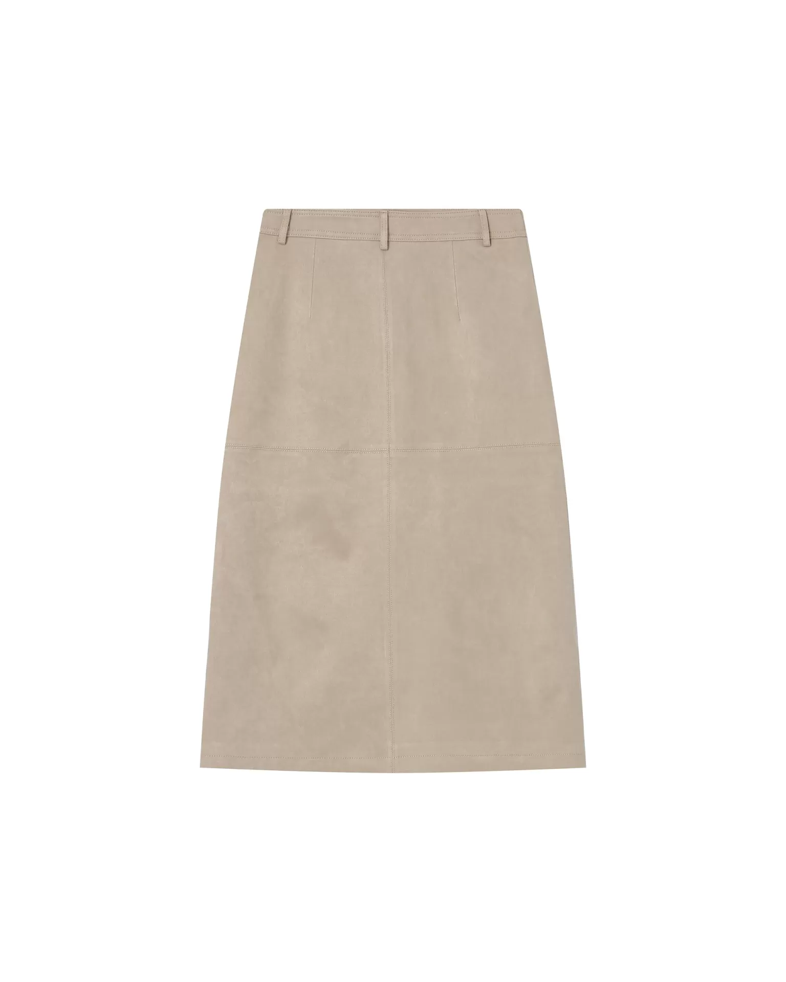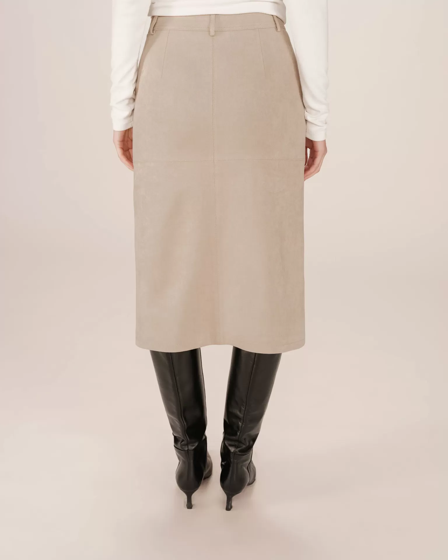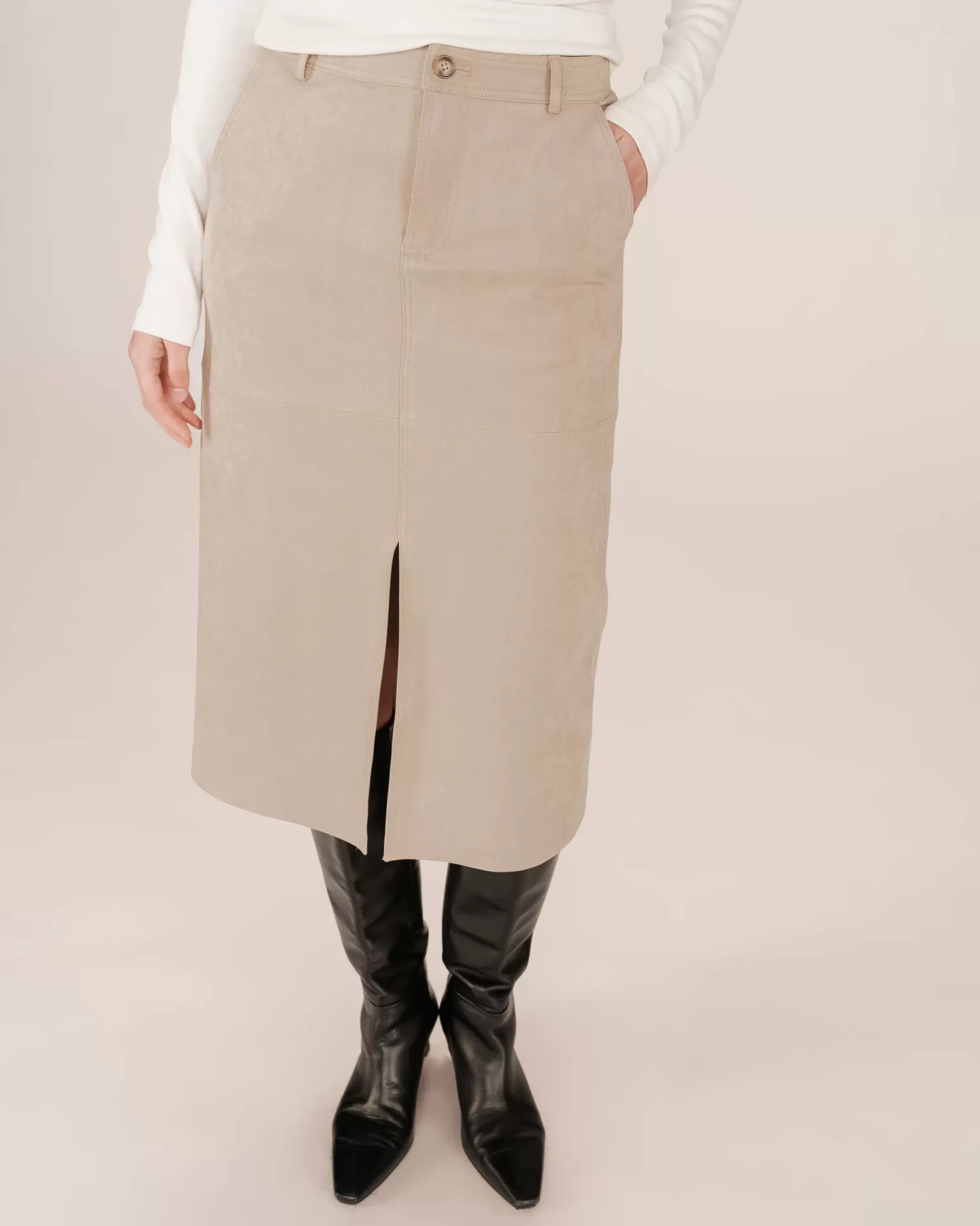 Saia Grace & Mila midi em camurça sintética, corte reto e cintura média, fecho na frente com zíper e botão, bolsos frontais estilo italiano e fenda frontal. Saia forrada.