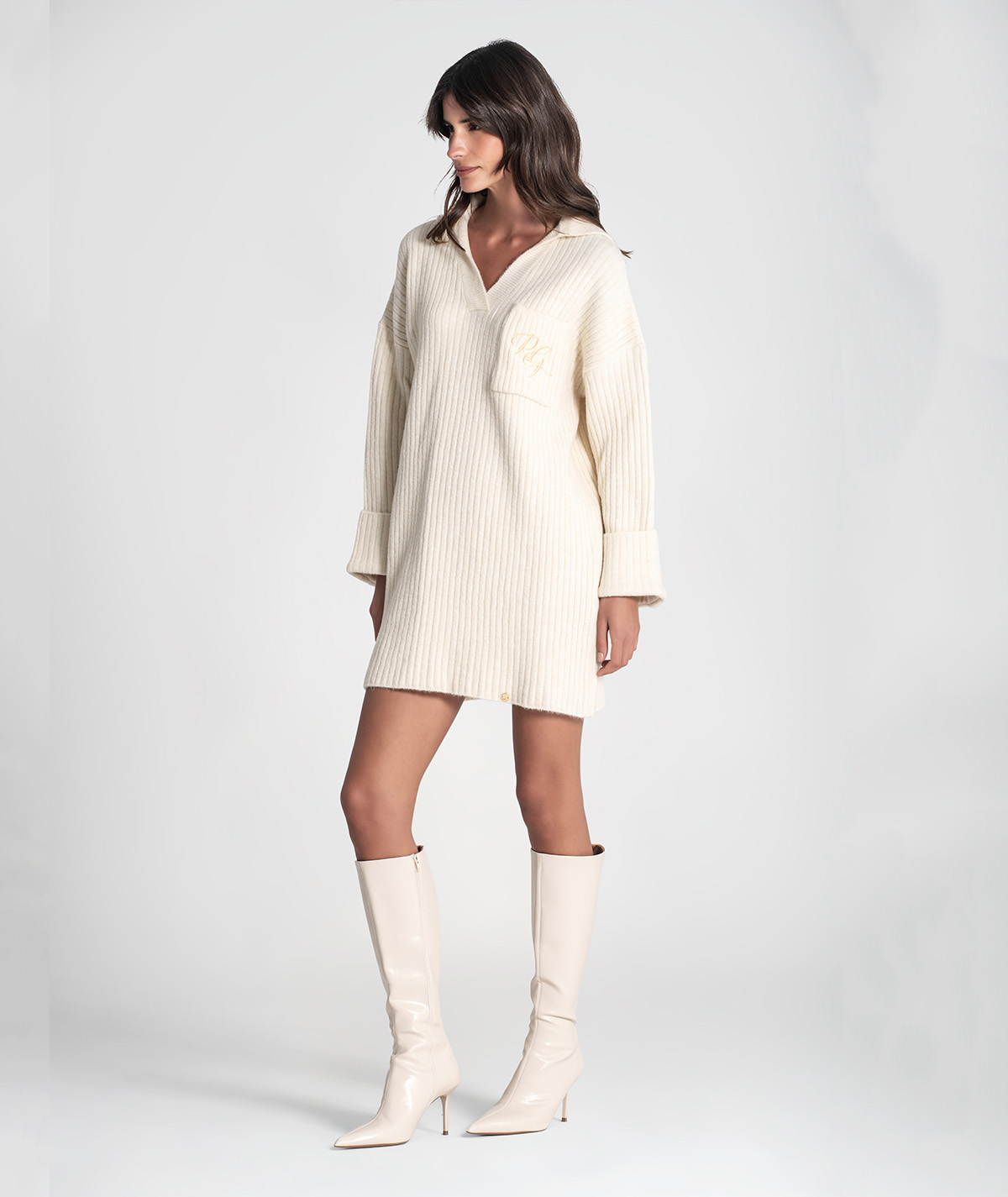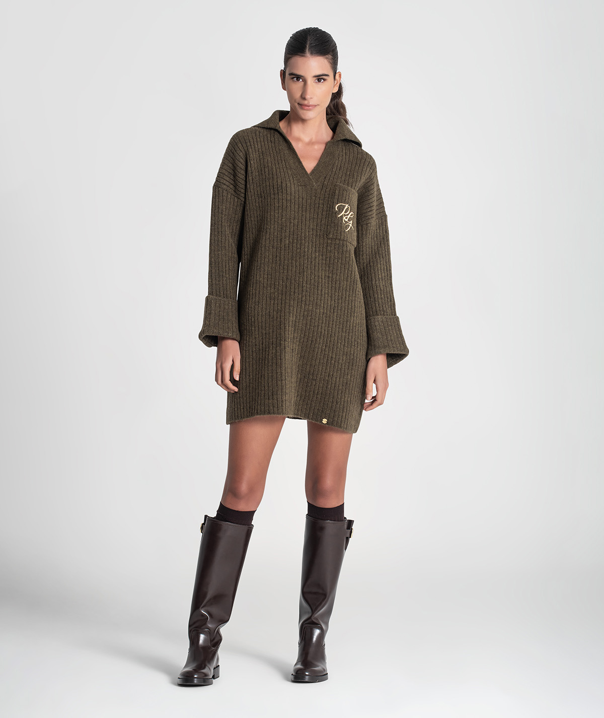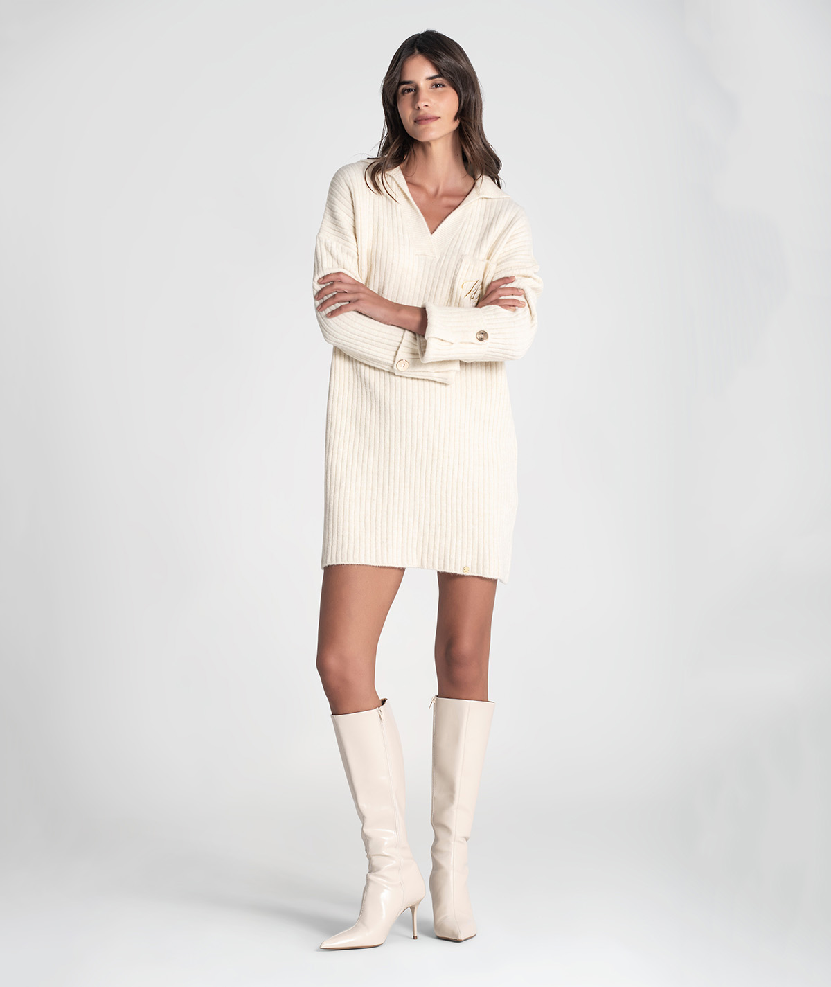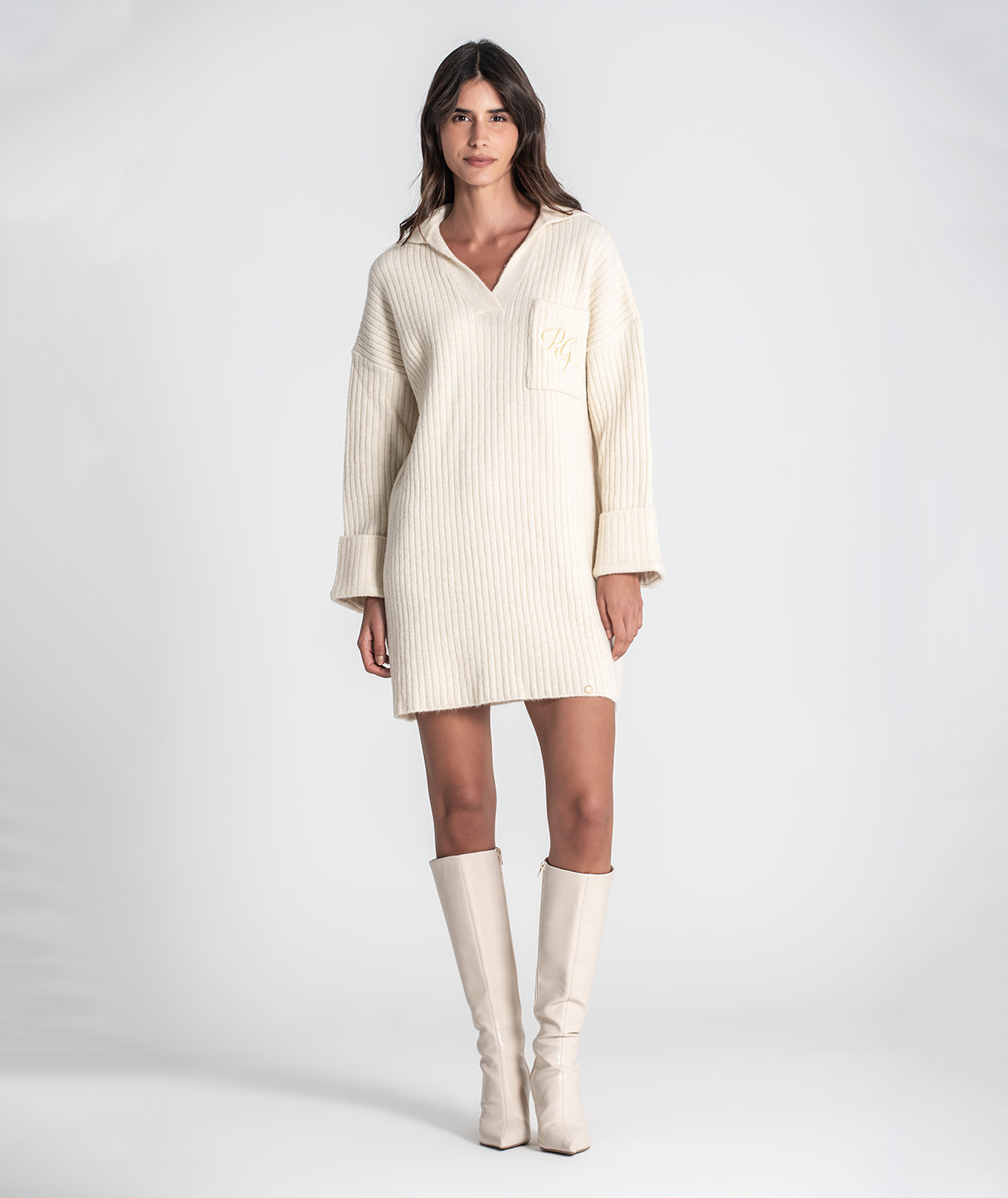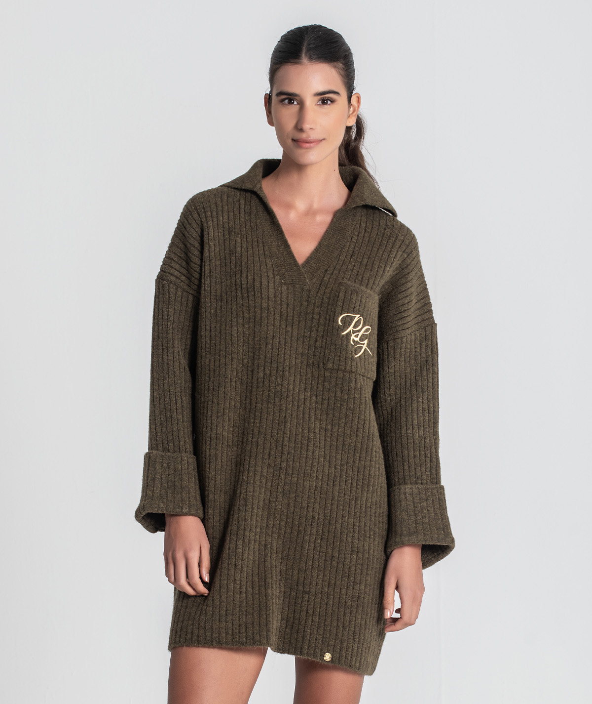 Vestido curto Rüga em malha canelada com bolso na frente com logo bordado em contraste, decote em V com gola estilo camisa e mangas compridas com virola e botão.