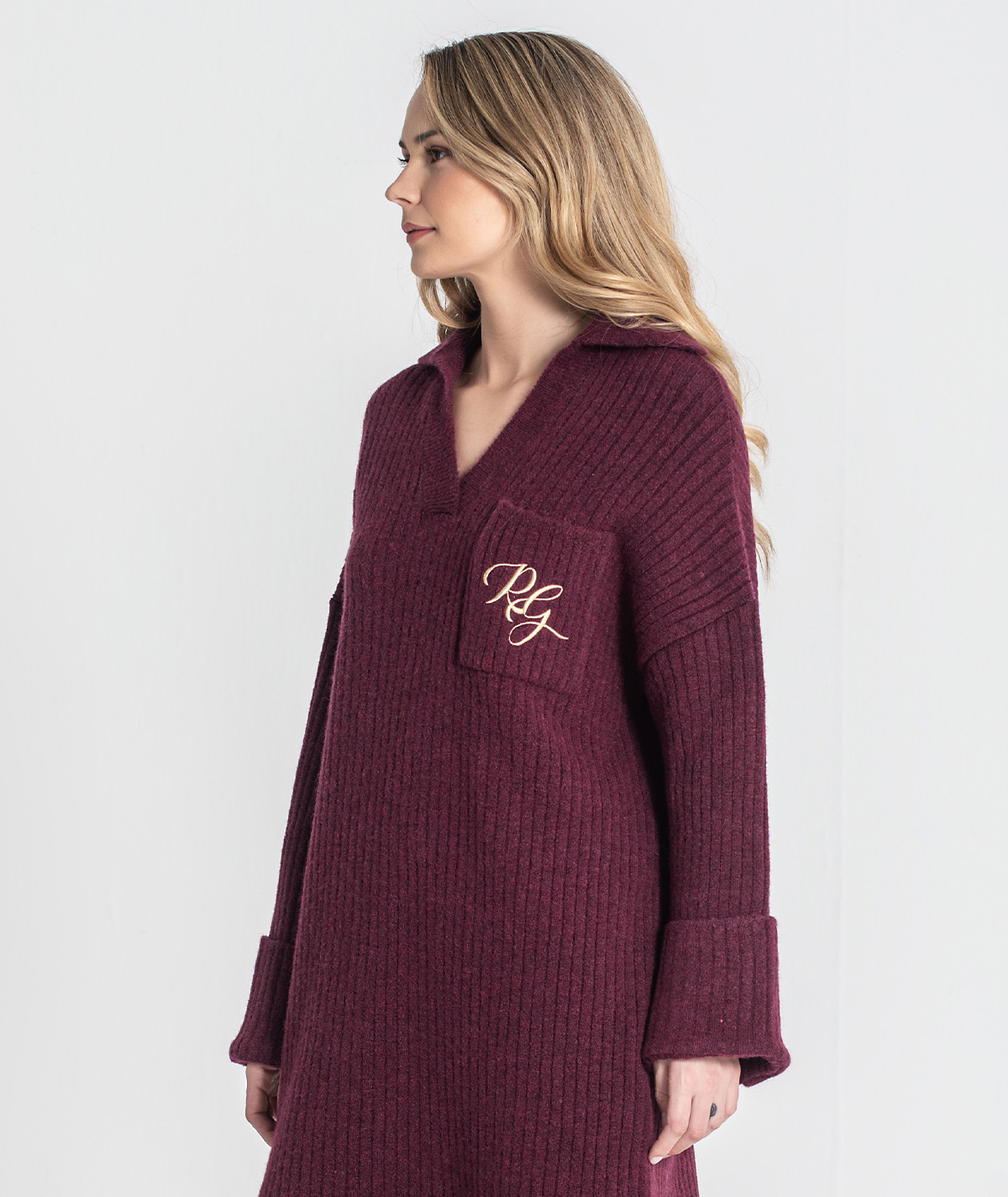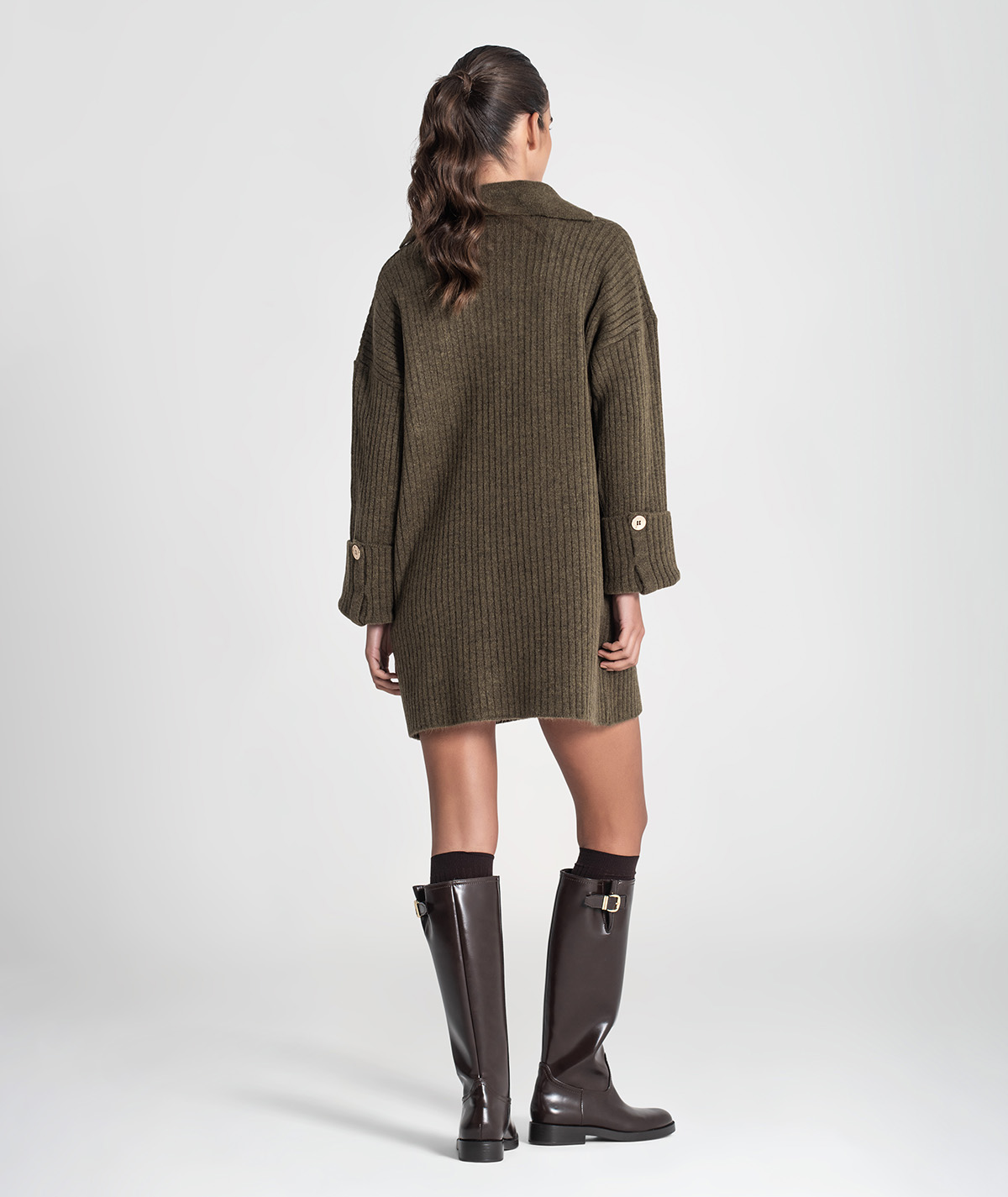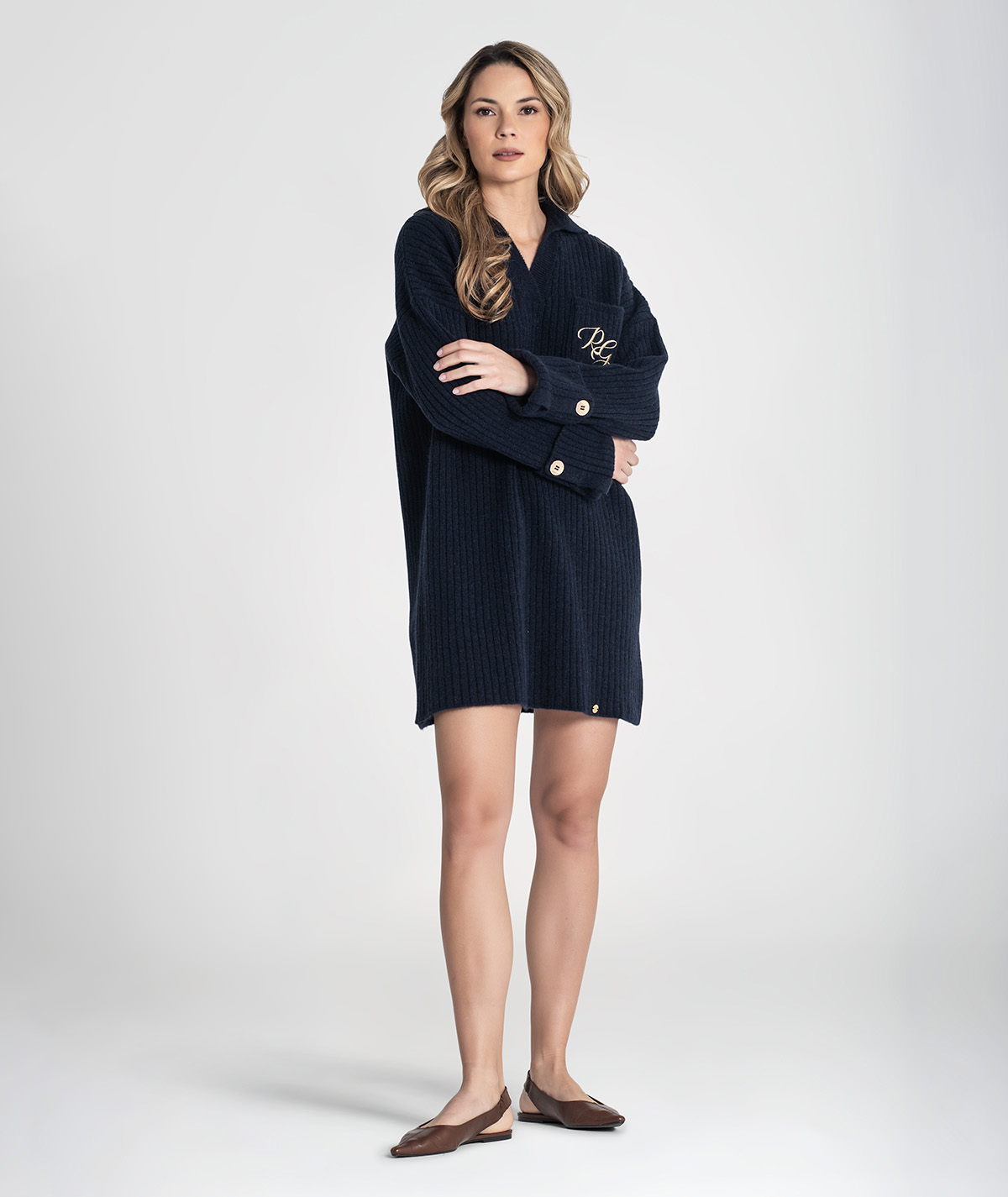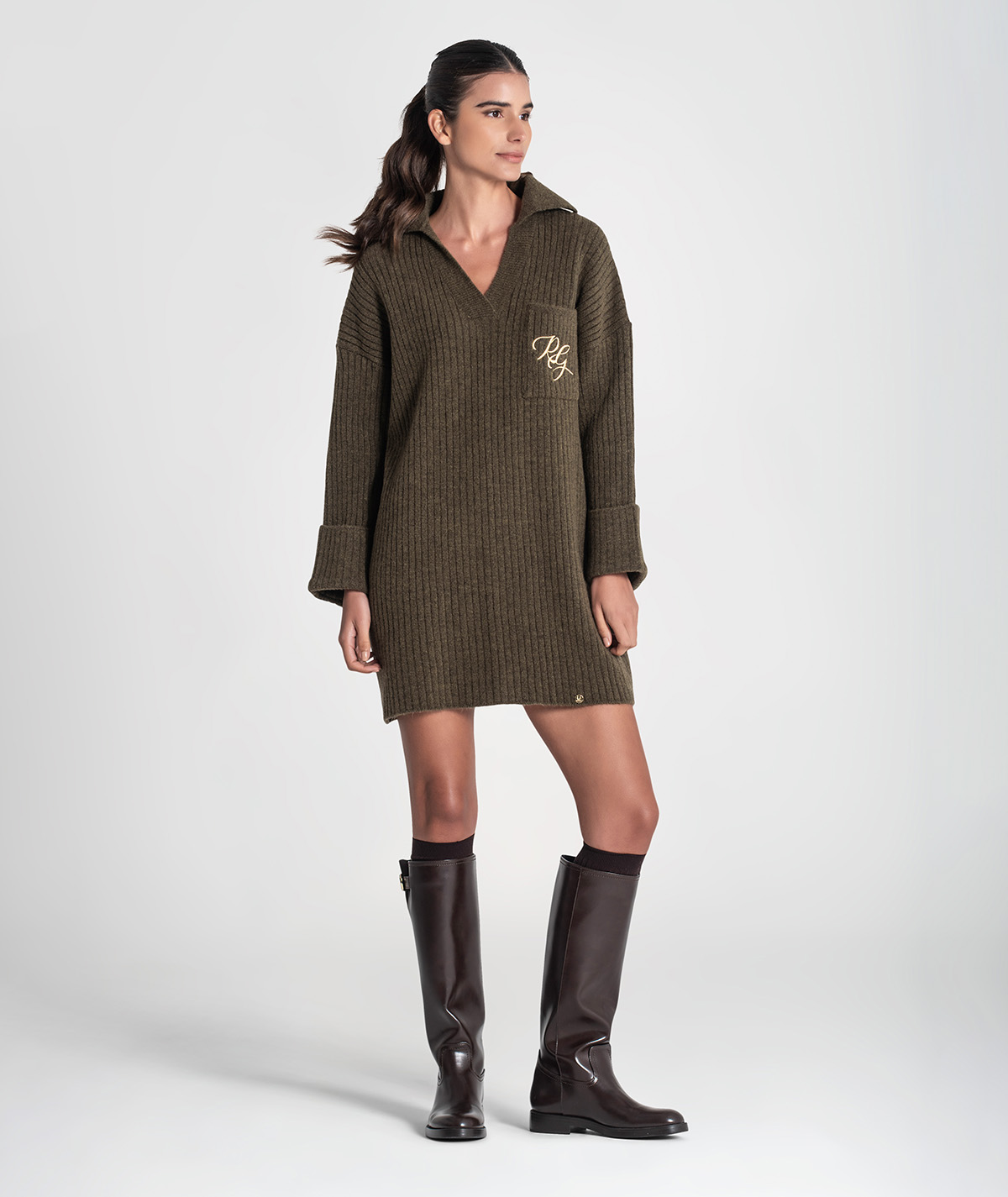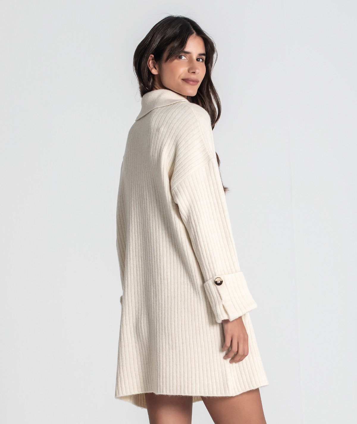 Vestido curto Rüga em malha canelada com bolso na frente com logo bordado em contraste, decote em V com gola estilo camisa e mangas compridas com virola e botão.