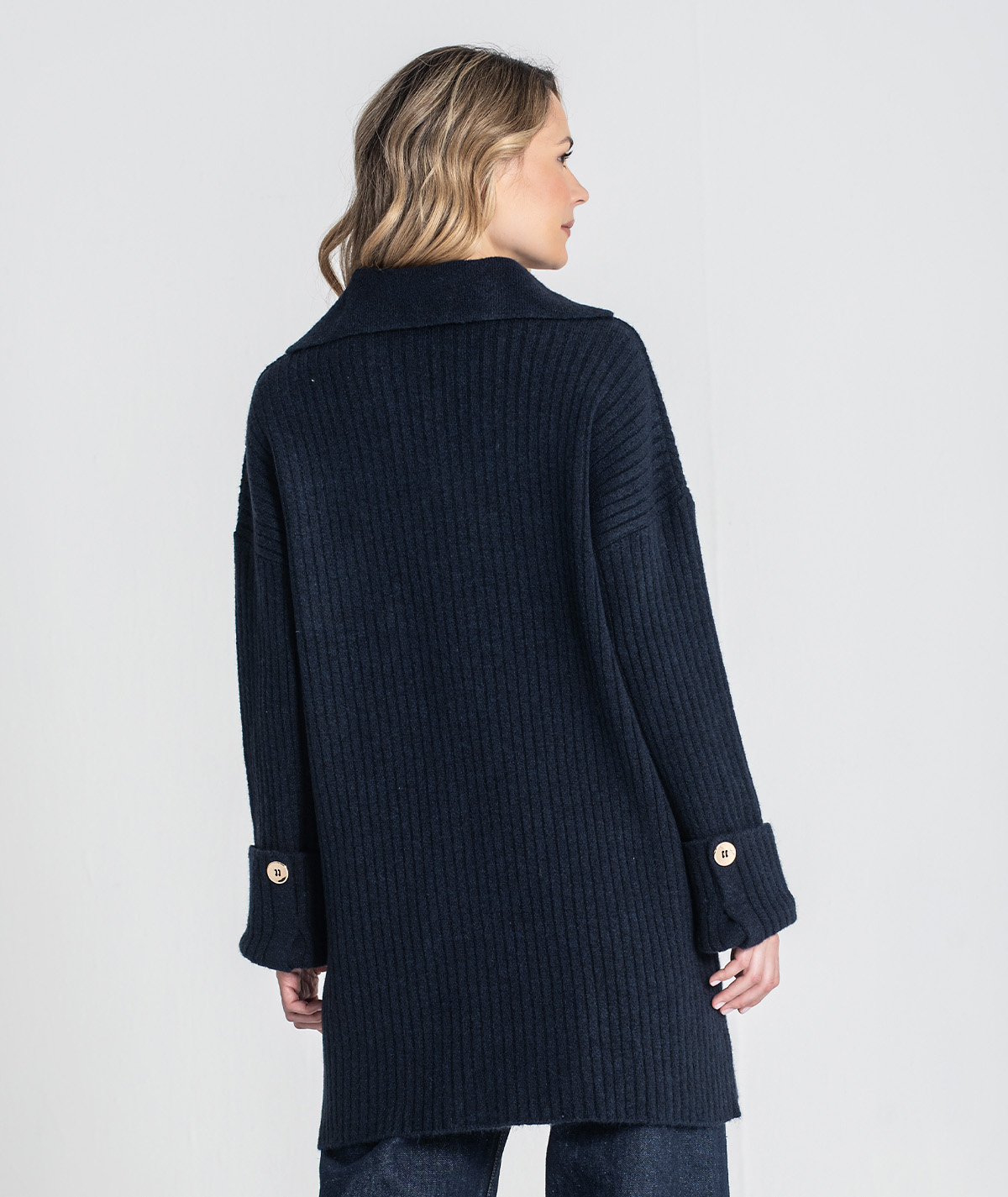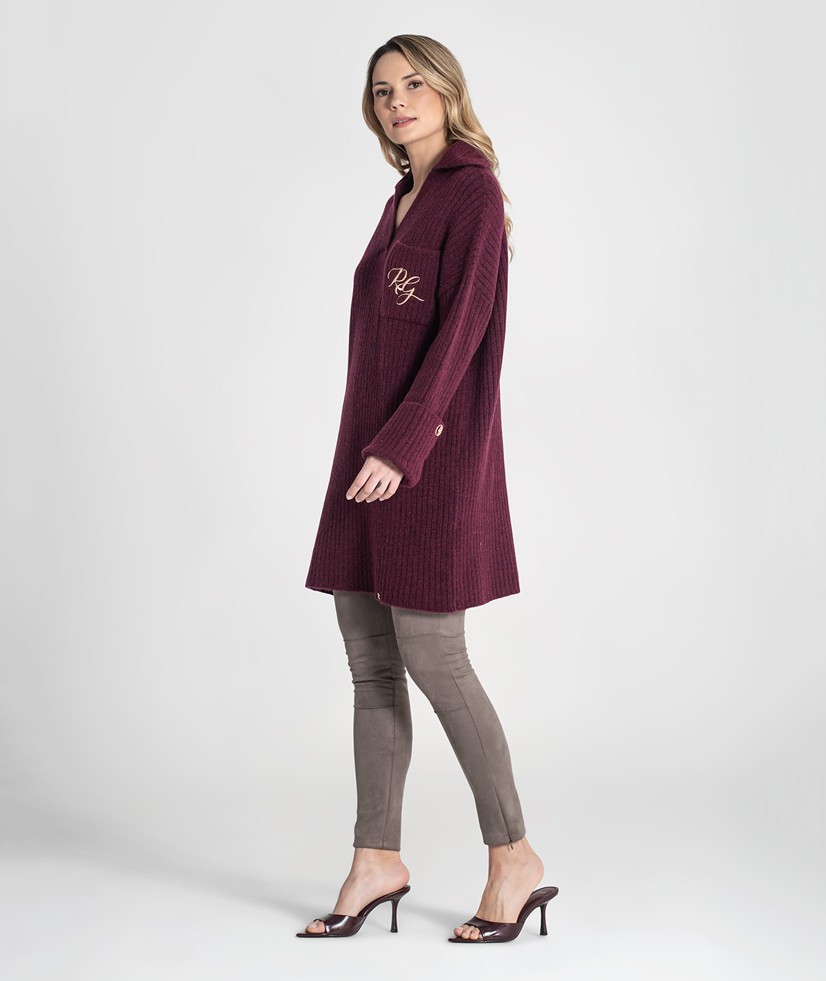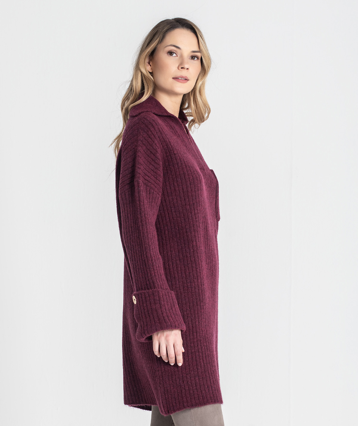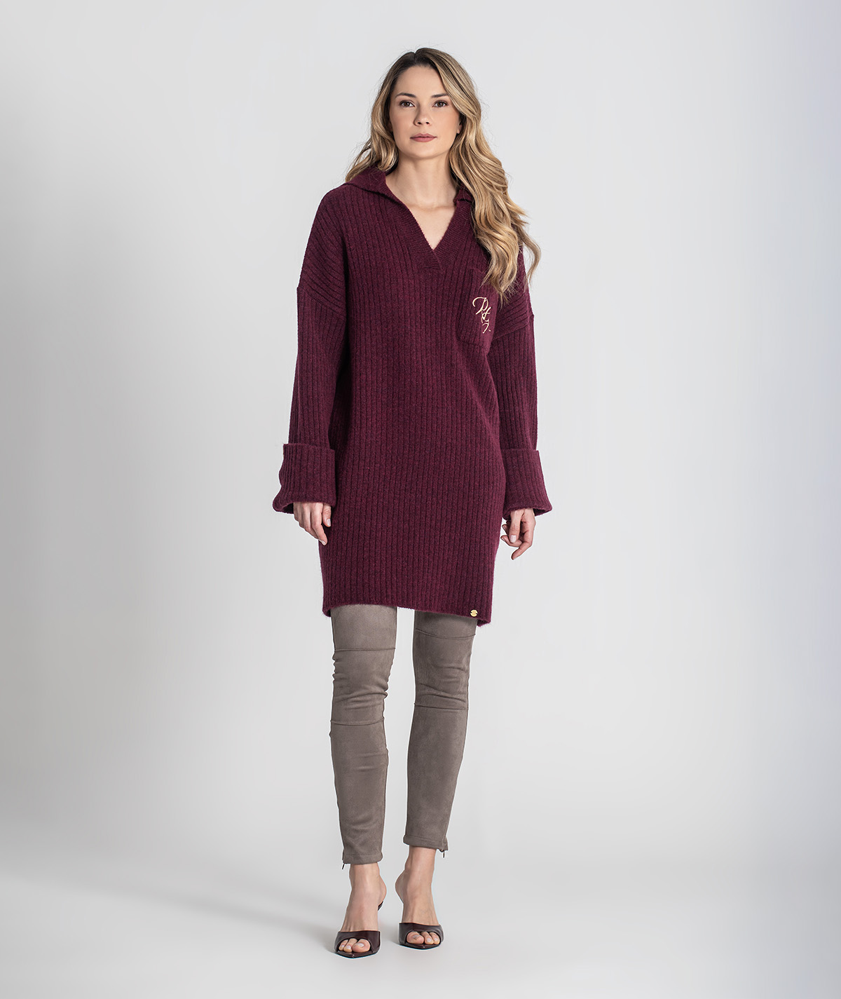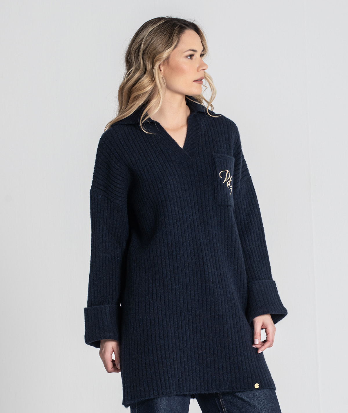 Vestido curto Rüga em malha canelada com bolso na frente com logo bordado em contraste, decote em V com gola estilo camisa e mangas compridas com virola e botão.