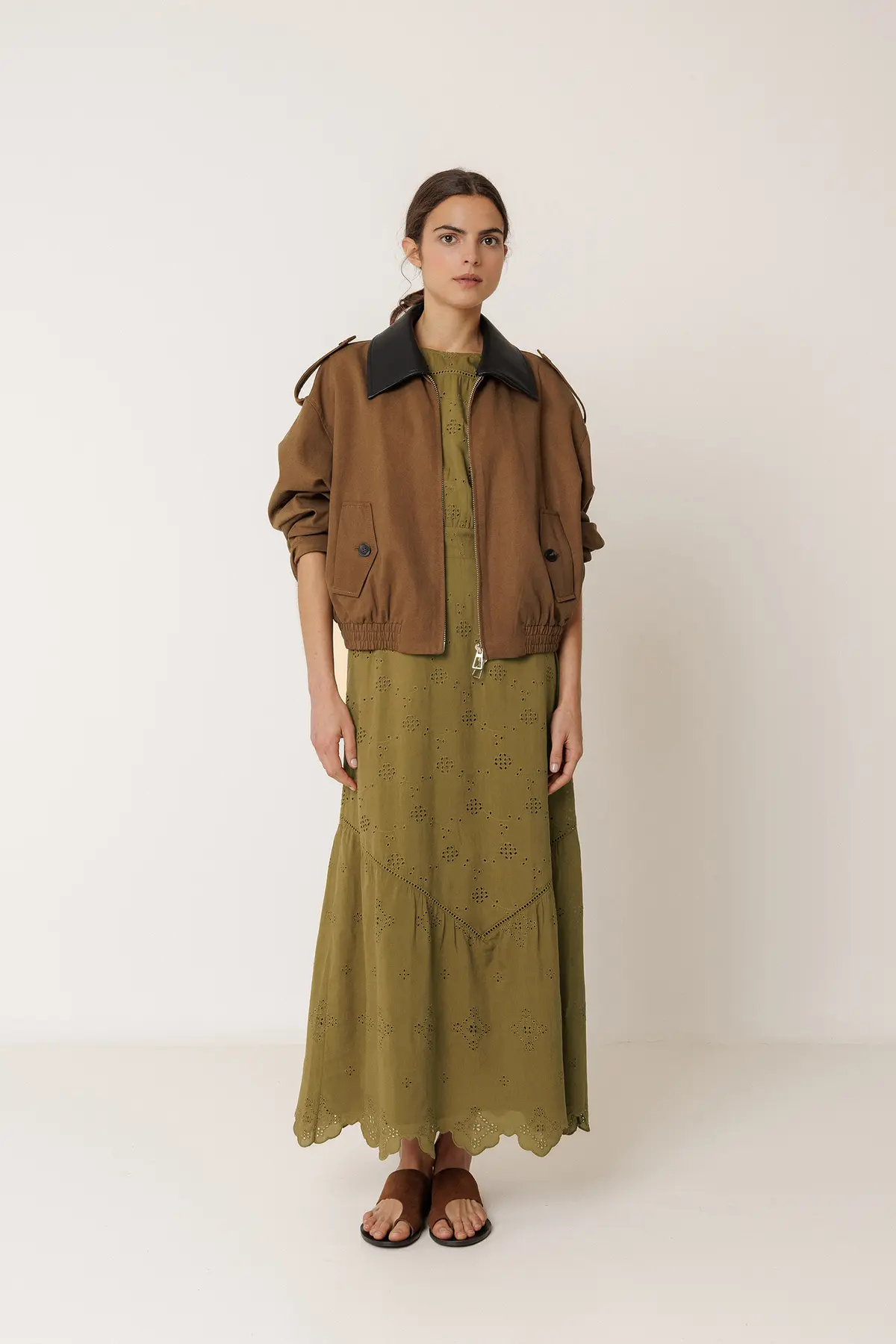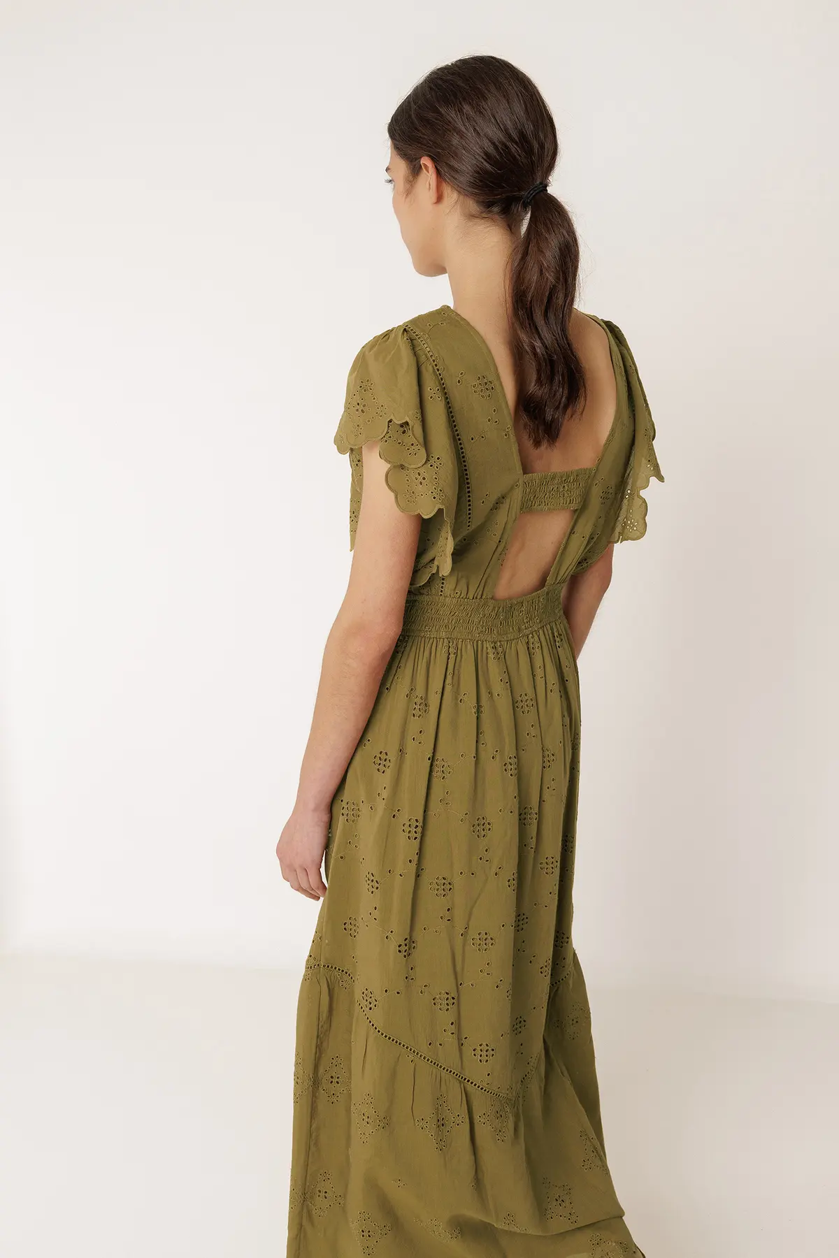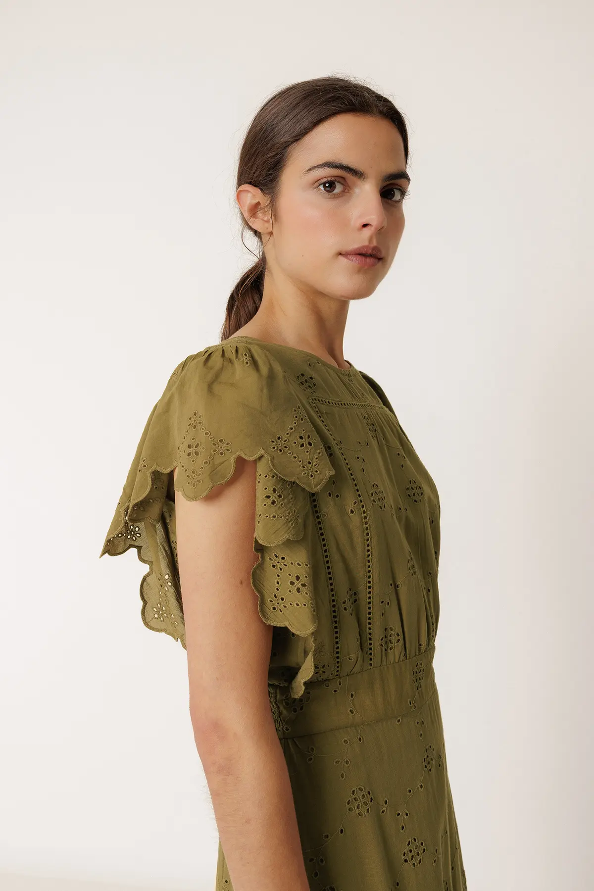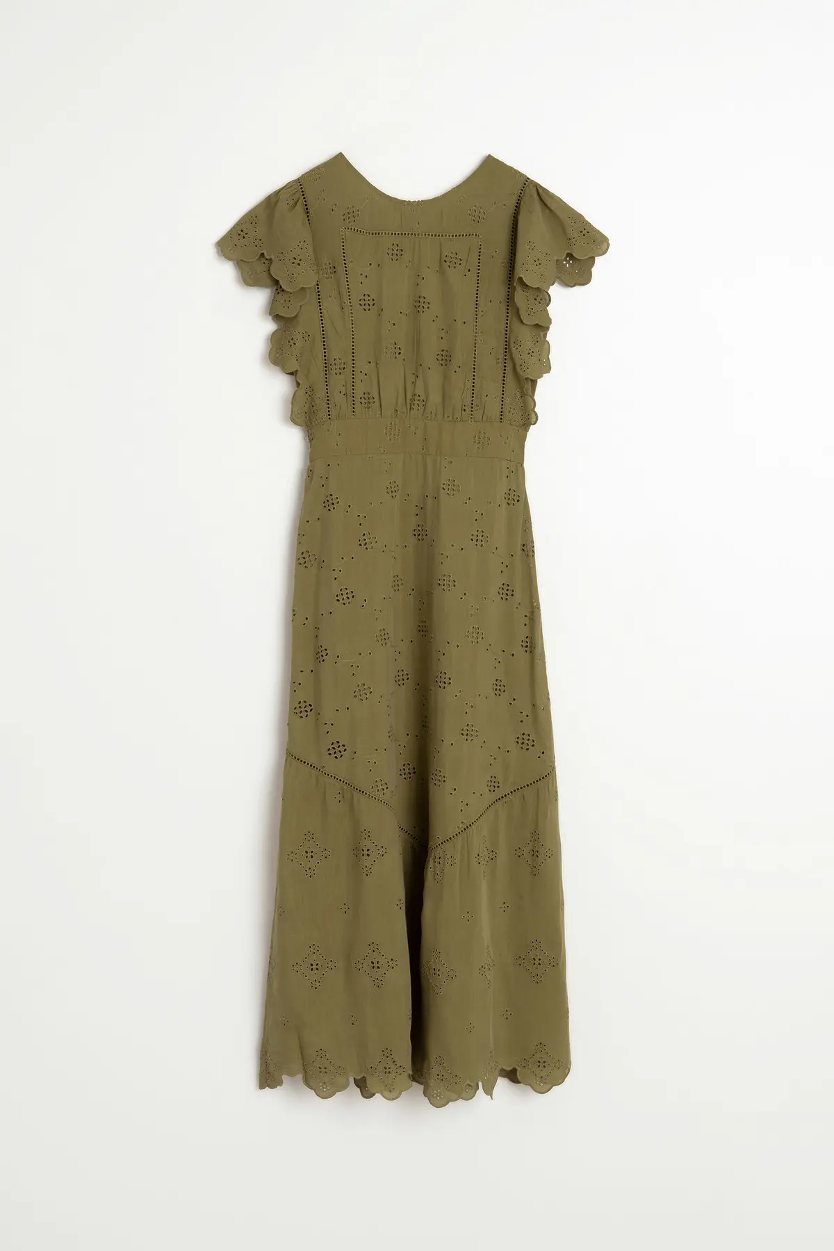 Vestido Indi&Cold midi em tecido de algodão com detalhes bordados, corte na cintura e acabamento ondulado na barra, costas abertas com alças elásticas, ombros ajustados e mangas com efeito renda. Vestido forrado.