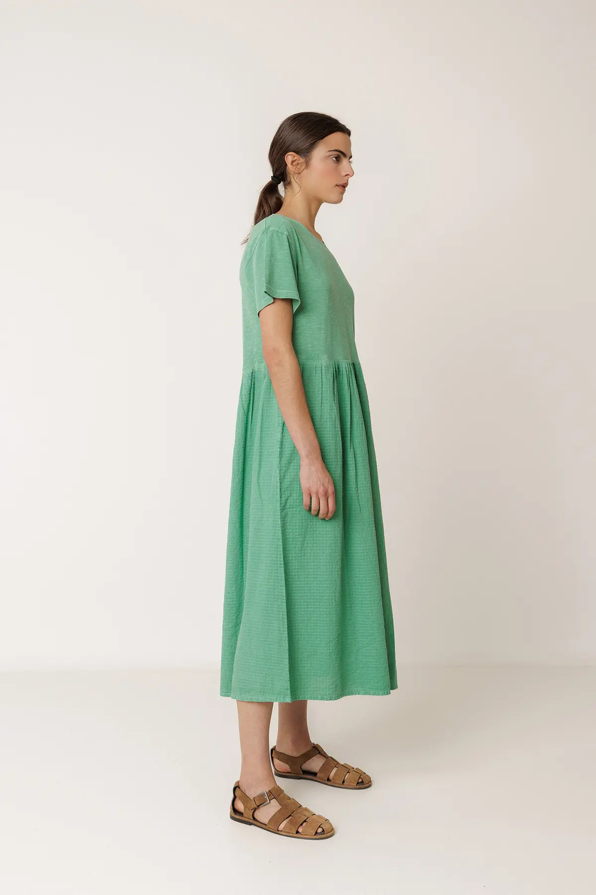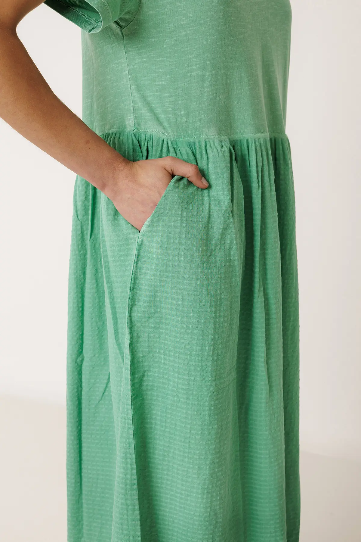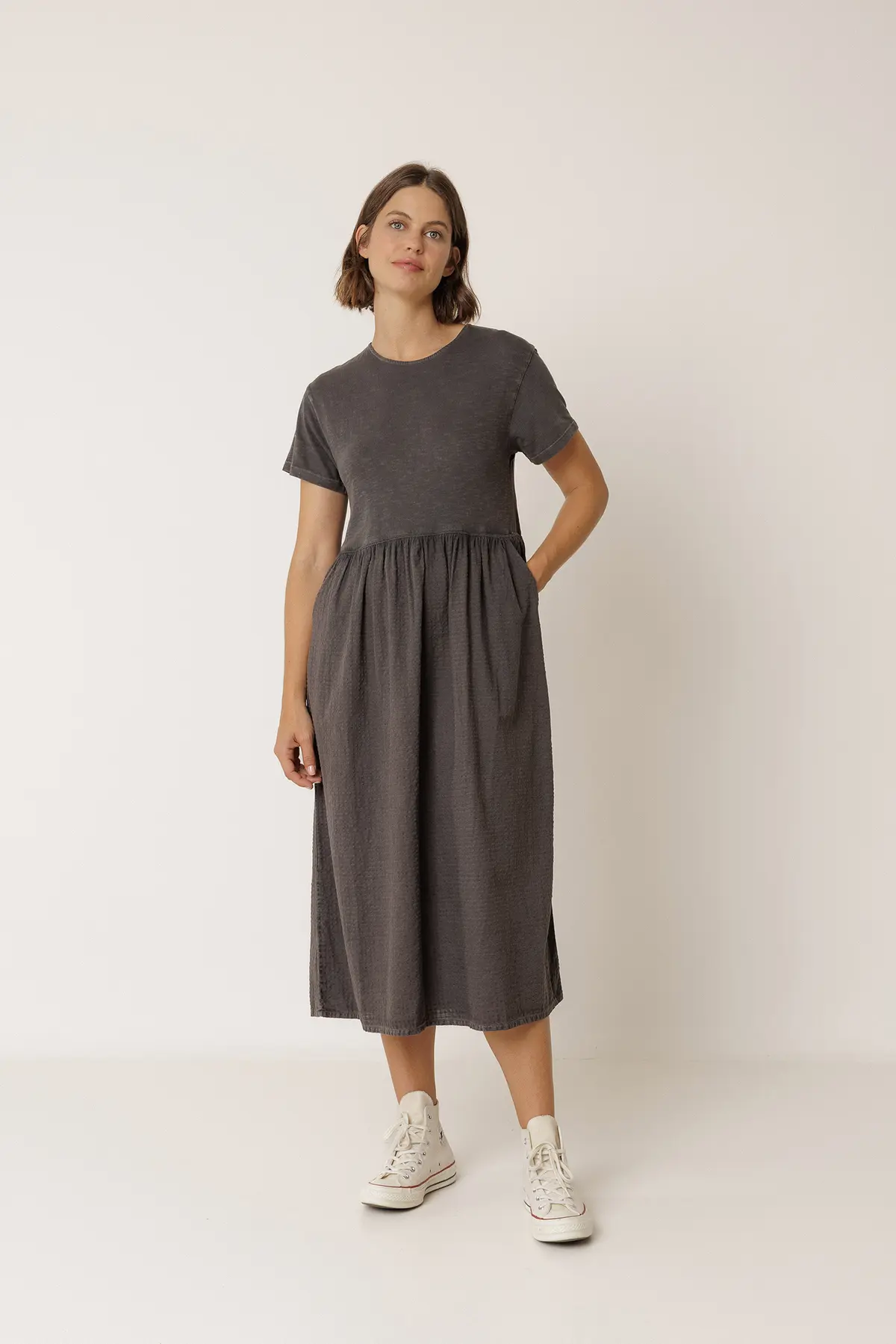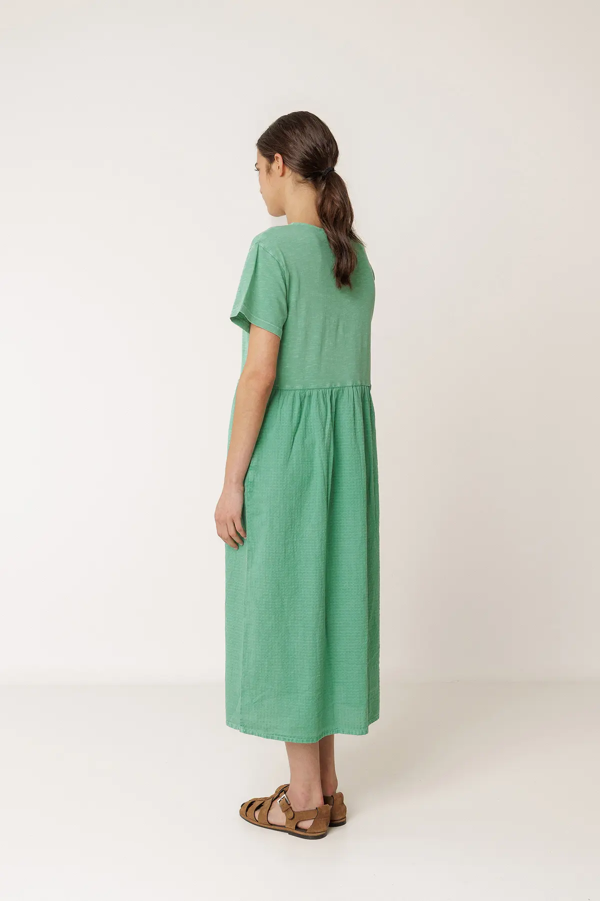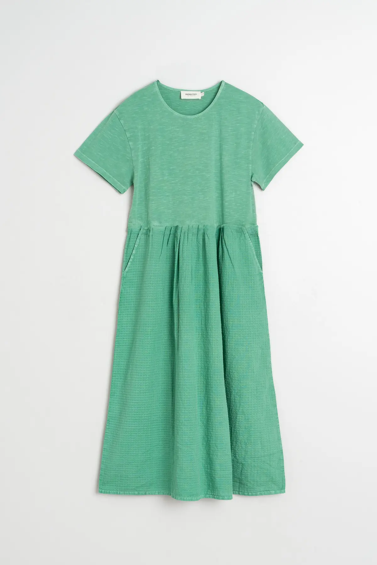 Vestido Indi&Cold de modelo midi e solto, tecido de malha texturizada combinada com algodão sustentável, decote redondo, corte na cintura e saia com babado, ombros caídos e mangas curtas.