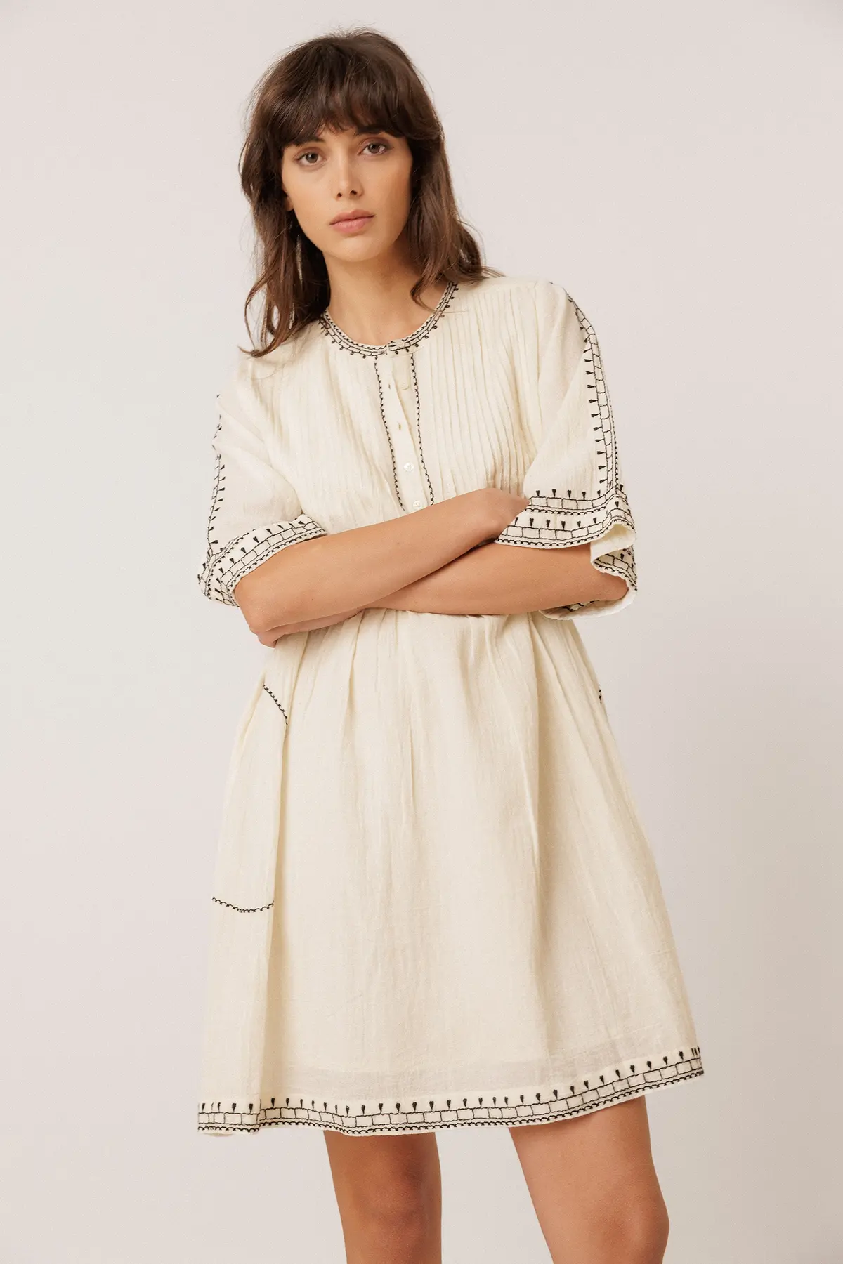 Vestido Indi&Cold de modelo curto e solto, decote redondo com carcela de botões e pesponto contrastante, prega vertical na parte superior frontal, mangas 3/4 amplas com punhos bordados e bolsos laterais arredondados com mangas decorativas.