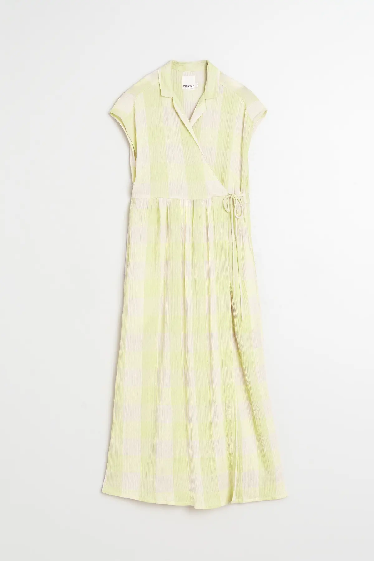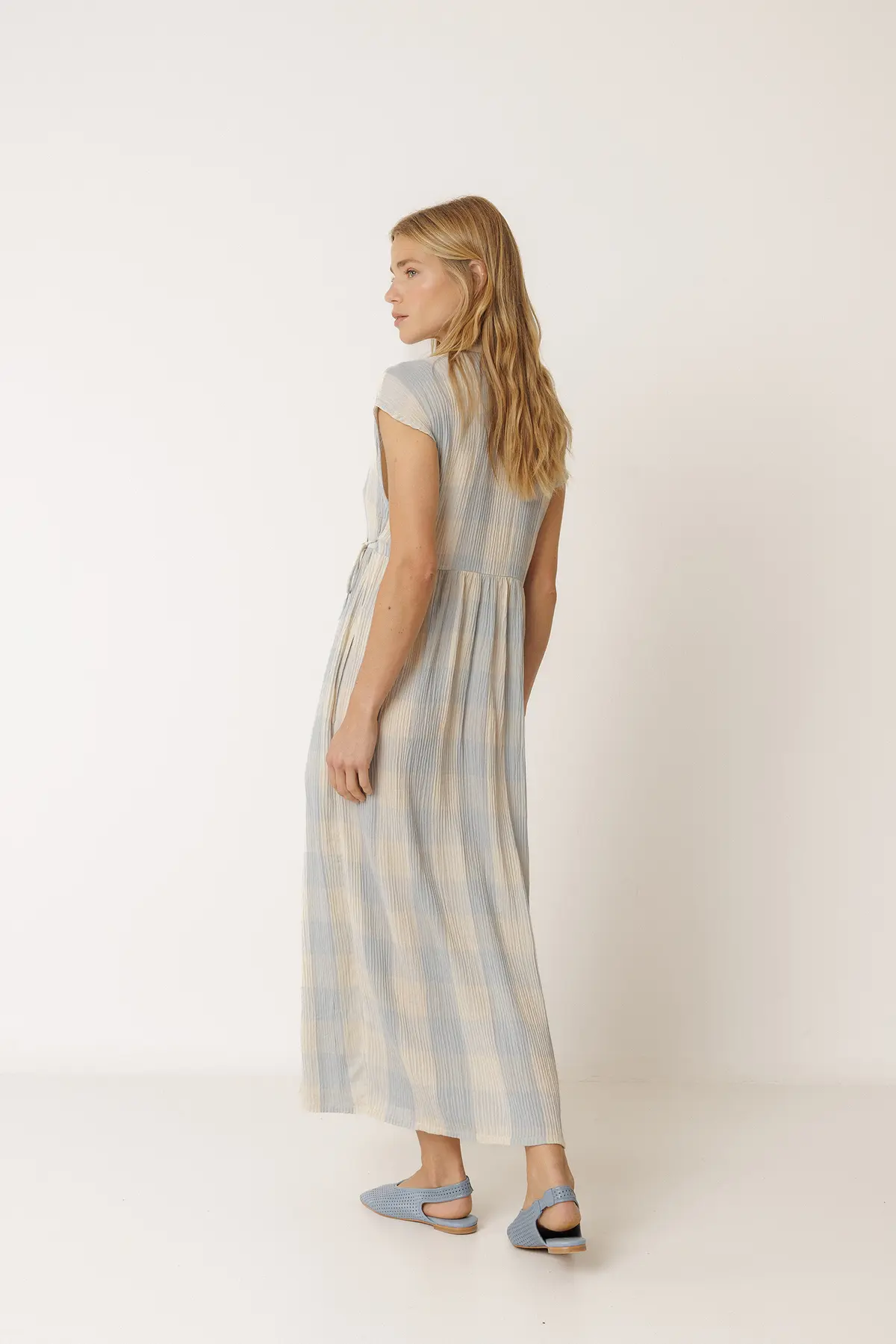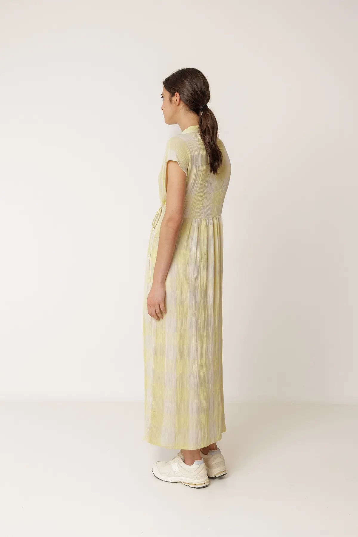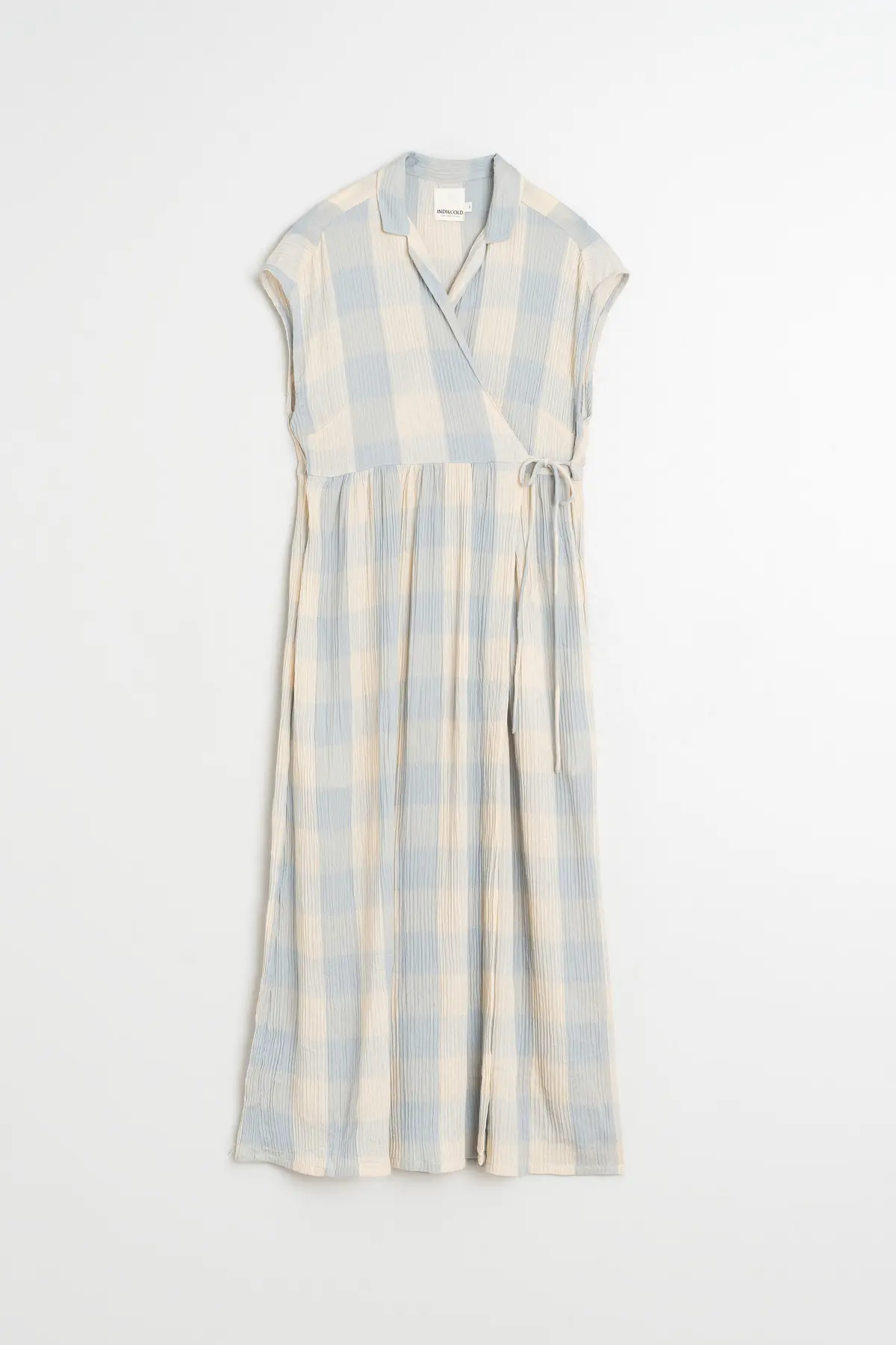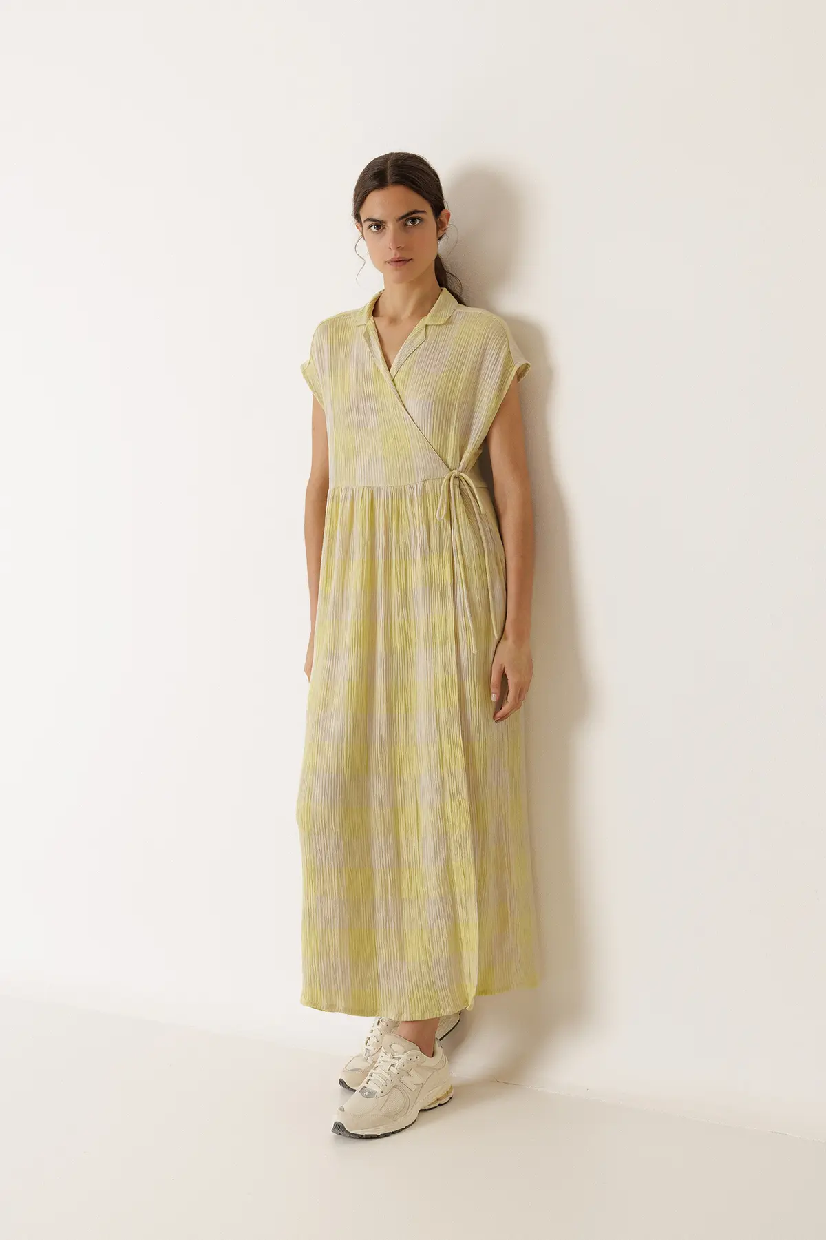 Vestido Indi&Cold comprido com padrão xadrez vichy, corte cruzado com fecho por amarração, ombros caídos e gola com lapela. Bolsos inseridos nas costuras.